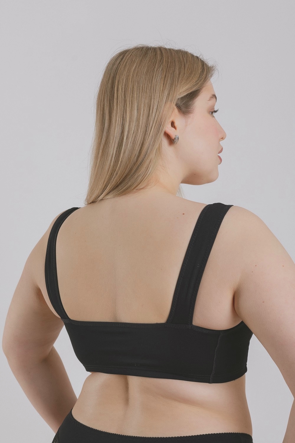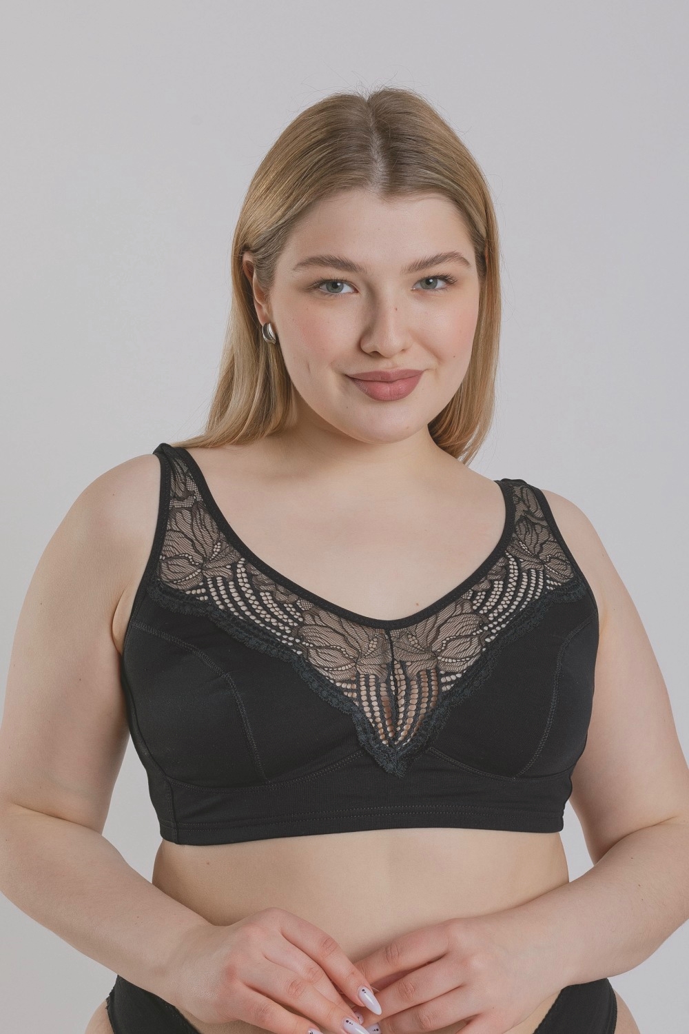 Комфортное практичное хлопковое трикотажное женское бюстье черного цвета. Изготовлено из высококачественного кулирного полотна пенье, содержащего 88% натурального хлопка, который характеризуется высокой гигроскопичностью, воздухопроницаемостью, безопасностью для здоровья, гигиеничностью. Незначительное добавление эластана повышает прочность и формоустойчивость изделия. Модель без застежки, на широких нерегулируемых бретелях, спереди украшена вставкой из мягкого кружева. Нижний край изделия обработан тесьмой-резинкой в закрытый срез. Конструкция лифа мягко повторяет очертания груди. Бюстье надевается через голову, как обычная майка, и предназначено для ежедневного использования в качестве удобного белья. Продуманная конструкция, надежные эластичные швы, текстурированные нити, специальные закрепки на швах - гарантия долговечности изделия при соблюдении правил по уходу за ним. Модель бюстье s1015