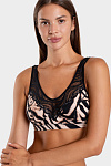 Эффектное комфортное трикотажное женское бюстье бежевого цвета с рисунком «зебра», со вставками из мягкого нежного чёрного кружева. Изготовлено из высококачественного хлопкового кулирного полотна пенье, которое характеризуется высокой гигроскопичностью, воздухопроницаемостью, безопасностью для здоровья, гигиеничностью. Добавление эластана в состав полотна повышает прочность и формоустойчивость изделия. Модель на удобной застежке с тремя рядами крючков. Широкие бретели по длине не регулируются. «Чашечки» лифа двухслойные. Нижний край изделия обработан тесьмой-резинкой в закрытый срез. Конструкция лифа мягко повторяет очертания груди. Продуманная конструкция, надежные эластичные швы, текстурированные нити, специальные закрепки на швах, качественные безопасные красители гарантируют долговечность изделия при соблюдении правил по уходу за ним. Модель бюстье s1089