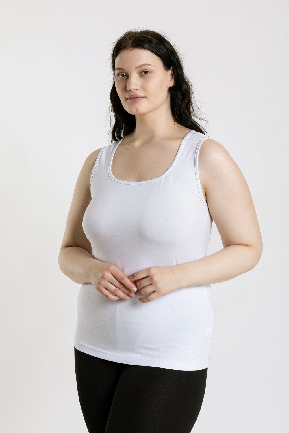 Белая хлопковая женская майка большого размера - базовая модель в гардеробе корпулентной женщины. Модель прилегающего силуэта, на широкой бретели, с глубоким овальным вырезом горловины. Майка изготовлена из высококачественного трикотажного кулирного полотна пенье, содержащего 95% натурального хлопка, отличающегося прекрасной воздухопроницаемостью, гигроскопичностью, гипоаллергенностью и мягкостью. Тщательно проработанная конструкция, прочные эластичные швы со специальными закрепками, наличие эластана в составе полотна – залог отличной посадки по фигуре и долговечности изделия. Майка сохранит форму и цвет при соблюдении правил по уходу за трикотажными изделиями, указанными на её ярлыке. Цвет белый. Модель майка s6247