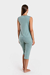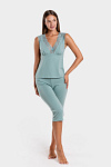 Хлопковая трикотажная женская пижама фисташкового цвета с отделкой из нежного кружева в тон. Состоит из майки и укороченных брюк - бриджей. Изготовлена из высококачественного кулирного полотна пенье, содержащего 45% натурального хлопка и 46% модала (вискозы) в майке и 48% натурального хлопка и 47% модала (вискозы) в брюках. Такое полотно шелковистое и мягкое на ощупь и характеризуется высокой воздухопроницаемостью, гигроскопичностью, гипоаллергенностью и безопасностью для здоровья. Майка полуприлегающего силуэта, с отрезным лифом и V-образным вырезом горловины. Горловина и проймы декорированы изящным кружевом. Бриджи свободные, прямого кроя. По талии неширокая тесьма-резинка, пришитая в закрытый срез. Прочные эластичные швы, текстурированные нити и специальные закрепки на швах – гарантия долговечности изделия при соблюдении правил по уходу за ним. Коллекция «Фисташка». Модель пижама s5170, s5117