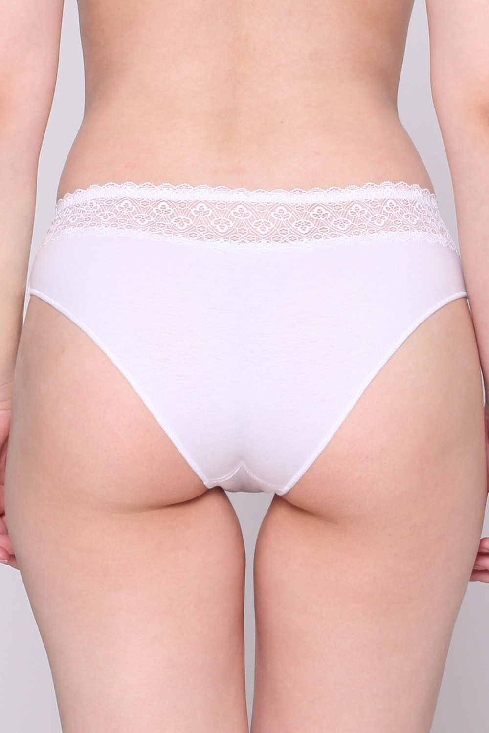 Белые нарядные женские трусы с низкой посадкой из кулирного трикотажного полотна, содержащего 95% хлопка и 5% эластана. По верхнему срезу изделия проложено белое широкое кружево, пришитое плоским швом внакладку. По внешнему ажурному краю кружева пристрочена тесьма резинка способом трехукольный зигзаг. Боковые швы стачные. Ластовица продублирована основным полотном и пришита плоскими швами. Срезы по ножкам обработаны тесьмой-резинкой на трехниточном оверлоке способом "закрутка", что обеспечивает их прочность, эластичность и незаметность под верхней прилегающей одеждой. Модель трусы s4571
