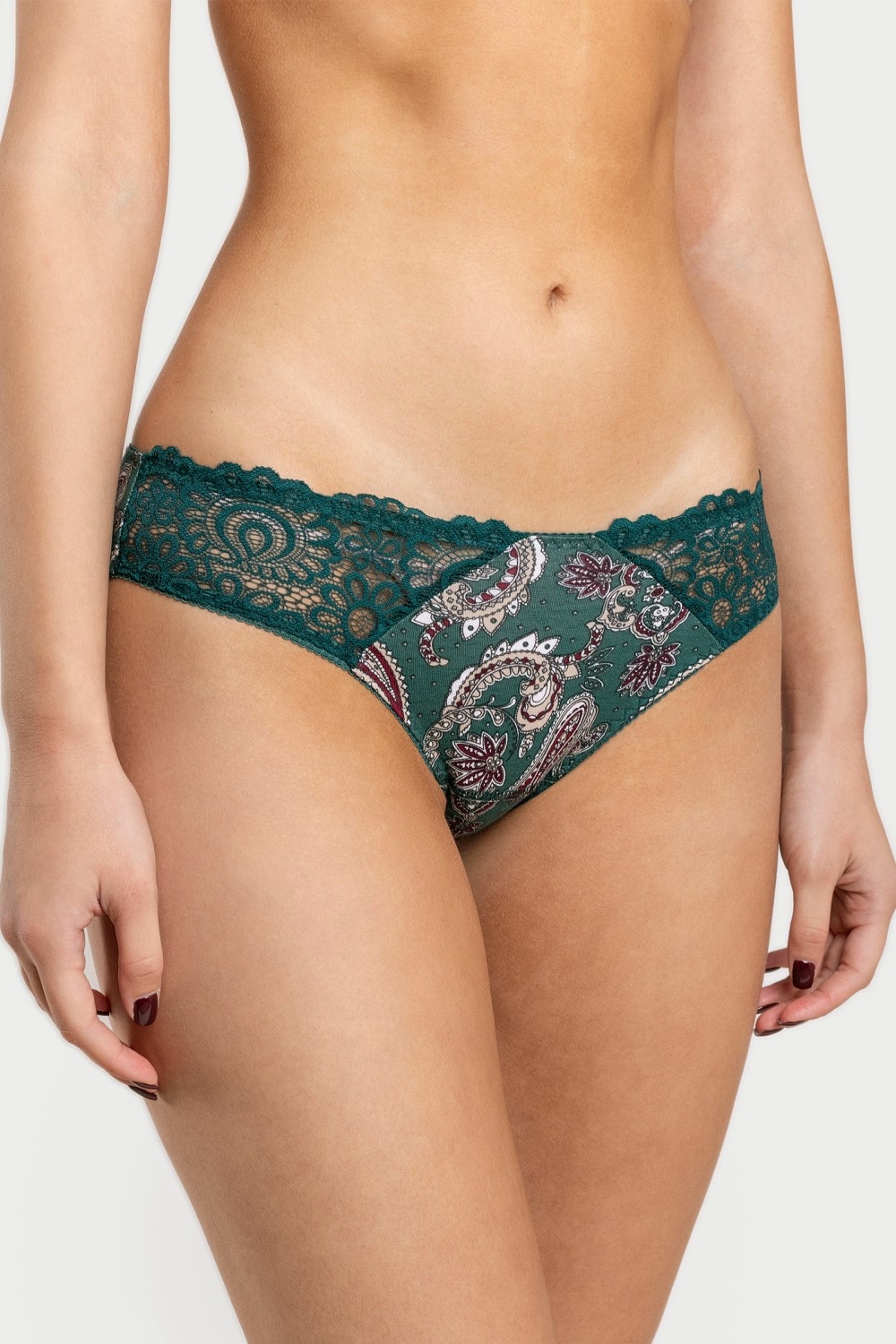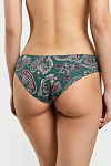 Женские трусы с низкой талией из кулирного трикотажного хлопкового полотна и вставками из мягкого эластичного кружева в тон. Кружево соединено с передней и задней деталями трусов аккуратными стачными швами. Срезы изделия обработаны тесьмой-резинкой с помощью трёхукольного зигзага. Ластовица двойная, продублирована основным полотном и пришита плоскими швами. Восточный орнамент "пейсли" на темно-изумрурдном фоне придает трусам изысканный вид. Модель трусы s4829