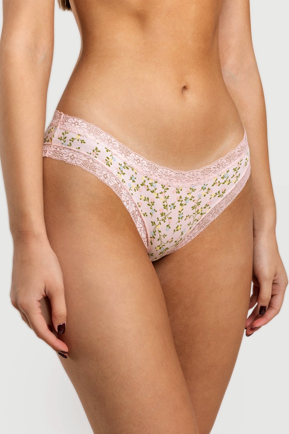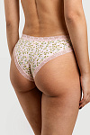 Женские трусы бикини светло-персикового цвета с рисунком "цветные незабудки" из хлопкового трикотажного кулирного полотна, содержащего эластан. Верхний срез изделия обработан тесьмой-резинкой при помощи трехукольного зигзага. Ластовица двойная, из основного полотна, пришита плоскими швами. Боковые швы стачные. По линии талии и контуру ножек трусы украшены мягкими эластичными кружевами в тон основе. Модель трусы s4852