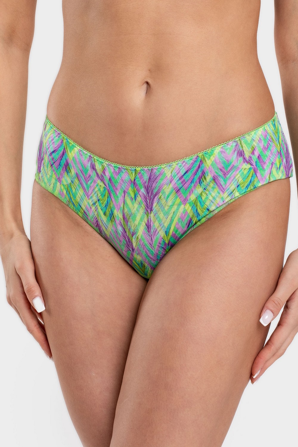 Лёгкие вискозные женские трусики-бикини с восточным орнаментом в оттенках сиреневого и зелёного цветов – базовая модель трусиков на низкой талии. 92% вискозы в составе полотна – это мягкость, шелковистость, воздухопроницаемость, гигроскопичность, гипоаллергенность и безопасность для здоровья. Наличие эластана в составе полотна и тщательно проработанная конструкция трусиков обеспечивают идеальную посадку по фигуре. По верхнему срезу трусов пришита тесьма-резинка трехукольным зигзагом. Ластовица двойная, внутренний слой из полотна основы. Нижние срезы по ножкам обработаны узкой тесьмой-резинкой на трехниточном оверлоке способом «закрутка». Прочные эластичные швы, текстурированные нити, специальные закрепки на швах – гарантия долговечности изделия. Модель трусы s4525
