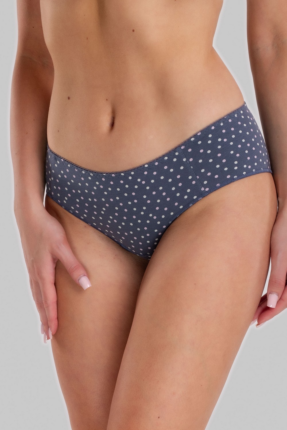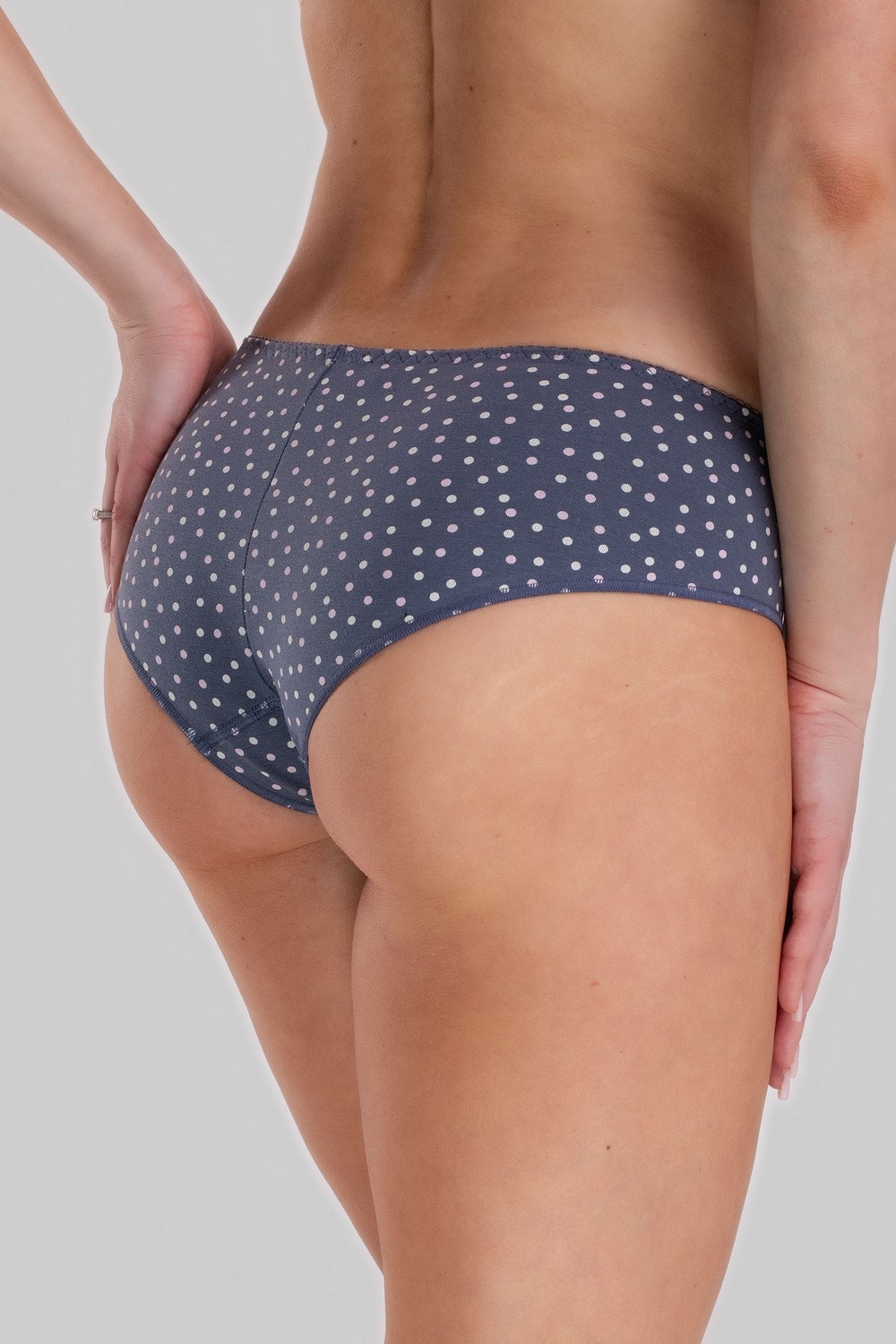 Комфортные хлопковые женские трусики-бикини серого цвета в бело-розовый горошек – базовая модель трусиков на низкой талии. Изготовлены из высококачественного хлопкового кулирного полотна пенье. 94% натурального хлопка – это свободное дыхание кожи, отсутствие аллергических реакций, гигроскопичность и комфорт на весь день. Наличие эластана в составе полотна и тщательно проработанная конструкция трусиков обеспечивают идеальную посадку по фигуре. По верхнему срезу изделие обработано тесьмой-резинкой трёхукольным зигзагом, срезы по ножкам - узкой тесьмой-резинкой на трехниточном оверлоке способом «закрутка». Ластовица двойная, из полотна основы. Передняя часть изделия состоит из трех деталей, соединенных между собой плоскими швами. По центру задней детали – аккуратный стачной шов. Прочные эластичные швы, текстурированные нити, специальные закрепки на швах, безопасные красители – гарантия долговечности изделия. Модель трусы s4526