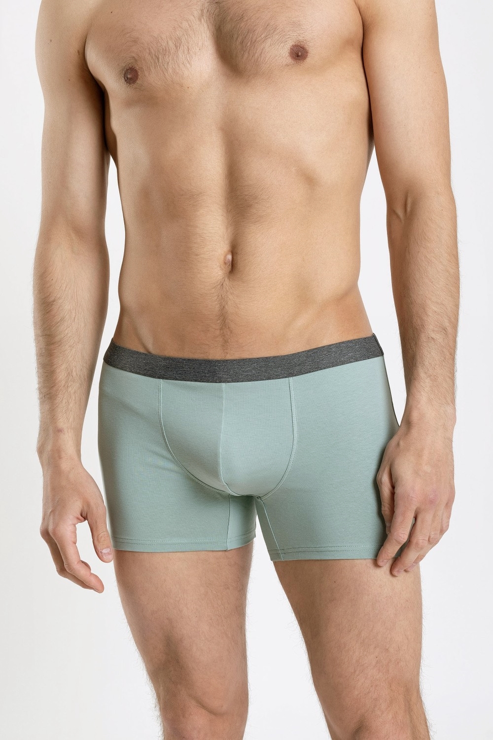 Мужские трусы боксеры изысканного светлого серо-зеленого цвета. Продуманный крой, высококачественное хлопковое трикотажное кулирное полотно с добавлением 8% эластана, мягкие аккуратные и прочные швы – гарантия безопасности для здоровья, комфортности, и долговечности изделия. По линии талии пристрочена плоским швом широкая тесьма-резинка контрастного темно-серого меланжевого цвета. Ластовица и гульфик двойные, выполнены из основного полотна. По бокам изделия стачные швы. Нижние срезы по ножкам подшиты плоскими швами вподгибку. Трусы сохранят свои форму и цвет при соблюдении правил по уходу за трикотажными изделиями. Модель трусы 7011