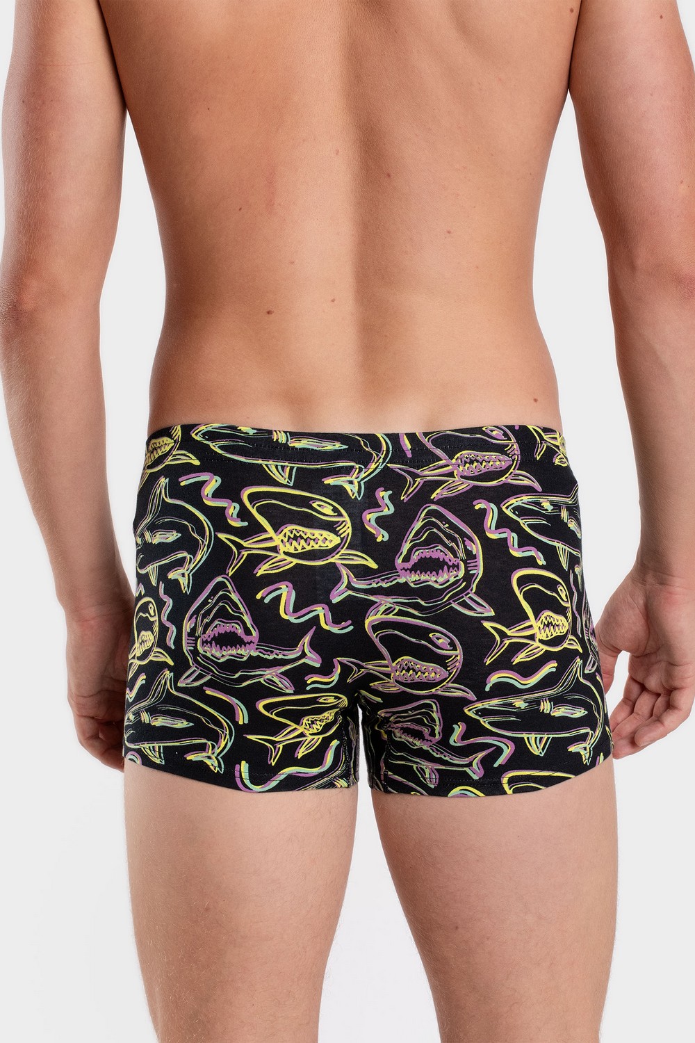 Классические мужские трусы боксеры из высококачественного хлопкового трикотажного кулирного полотна пенье. 94% хлопка в составе полотна, продуманный крой, специальные плоские швы двойной ластовицы – это комфорт в течение дня, безопасность для здоровья, отсутствие аллергических реакций, дыхание кожи и свобода движений. По линии талии изделие обработано удобной широкой тесьмой-резинкой в закрытый срез. Стачные швы по бокам и сзади отсутствуют. Современное оборудование и технология пошива, качественные текстурированные нити, прочные и безопасные красители – залог долговечности изделия. Активный рисунок «неоновые акулы» на черном фоне трусов притягивает взгляды своей яркостью и экспрессией. Изделие сохранит свои форму и цвет при соблюдении правил по уходу, указанных на его ярлыке. Модель трусы 7039
