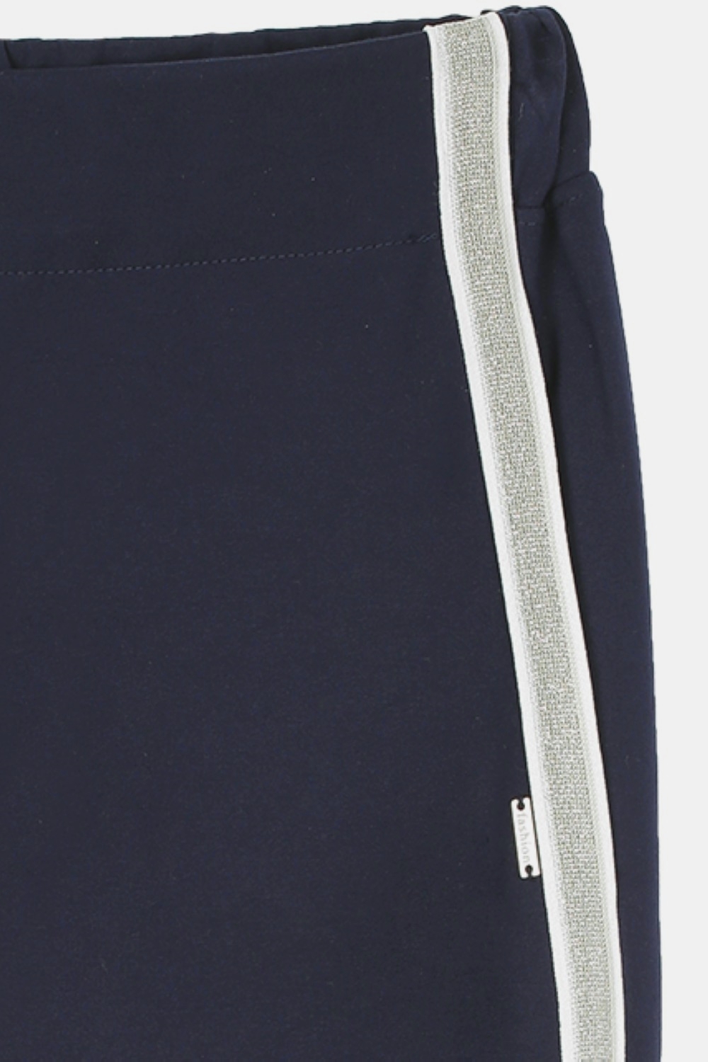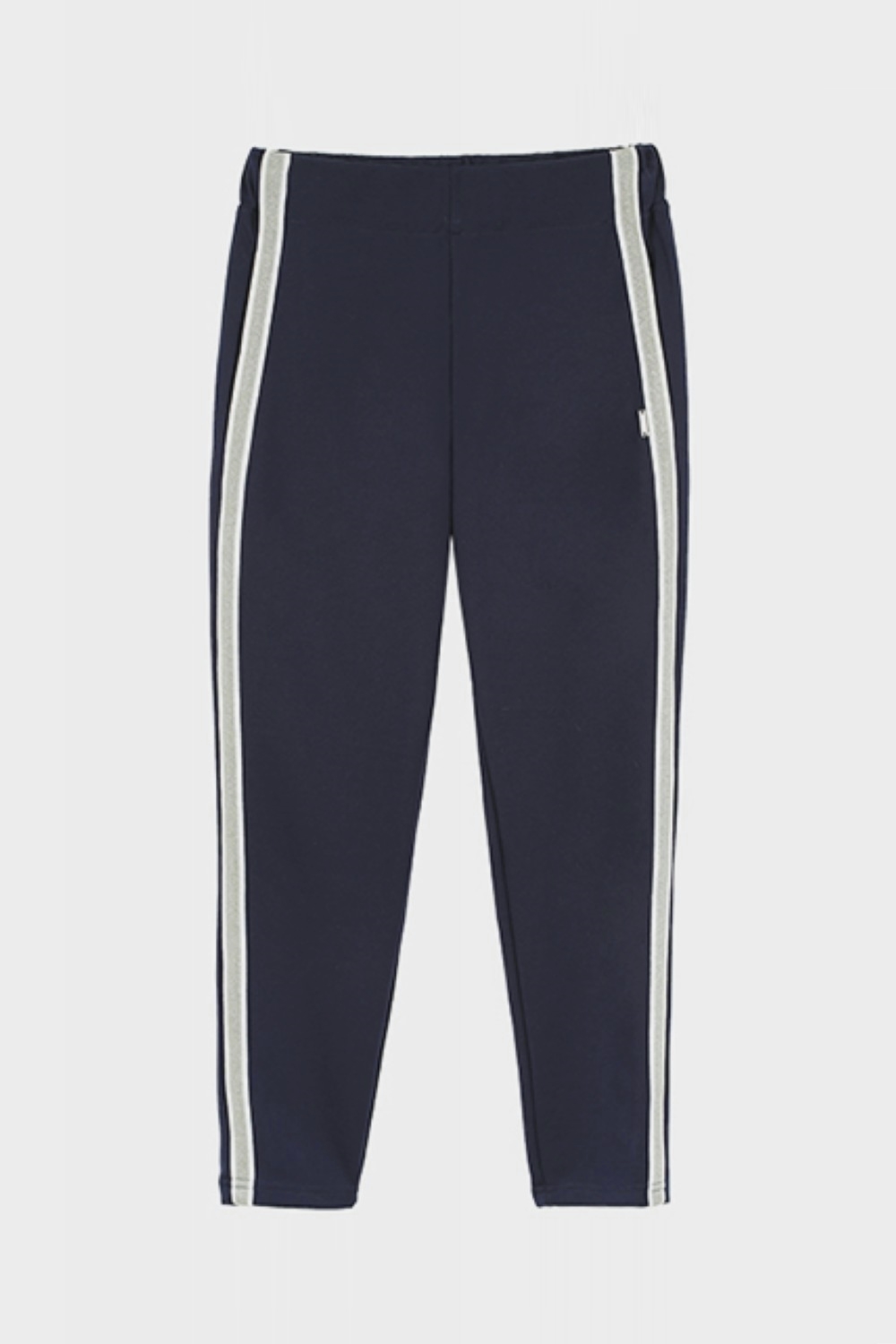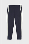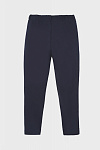 Модные темно-синие трикотажные брюки, легинсы для девочки. Изготовлены из высококачественного трикотажного полотна «милано», содержащего 65% вискозы, которая обеспечивает комфорт при использовании изделия, а также безопасность для здоровья ребенка. Полотно достаточно плотное на ощупь, не мнется, хорошо сохраняет форму, что очень важно для поддержания опрятного внешнего вида девочки на протяжении всего дня в школе и дома. Модель полной длины, штанины зауженные книзу. Лампасы из серебристой тесьмы с белыми кантами по краям. По бокам легинсов внутренние карманы. Пояс пришивной, внутри широкая эластичная тесьма-резинка. Высокое качество ткани, прочные швы, безопасные для здоровья красители – залог долговечности изделия при соблюдении правил по уходу за ним, указанных на ярлычке. Модель брюки 192111/1
