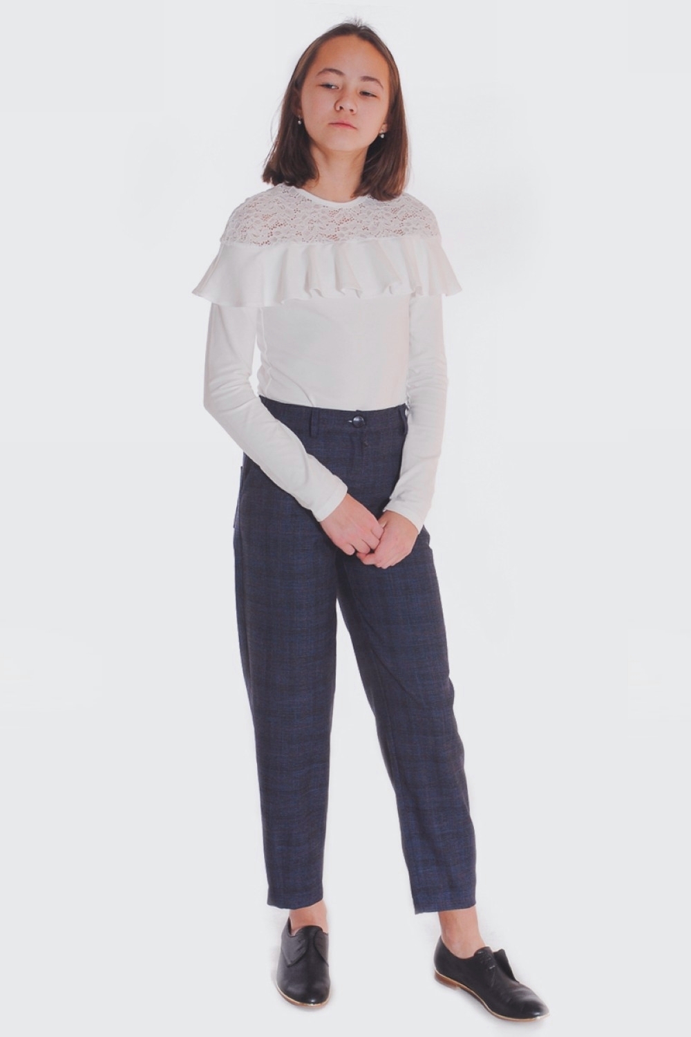 Темно-синие, в неяркую клетку, текстильные брюки для девочки. Изготовлены из ткани, содержащей 48% вискозы, которая обеспечивает комфорт при использовании изделия, а также безопасность для здоровья ребенка. Благодаря добавлению полиэфира и эластана в состав материала, изделие не мнется, хорошо сохраняет форму, что очень важно для поддержания опрятного внешнего вида девочки на протяжении всего дня в школе и дома. Модель полной длины, брючины слегка зауженные книзу. По бокам внутренние карманы, сзади – два накладных. Пояс пришивной, внутри эластичная тесьма-резинка. На поясе четыре шлёвки для ремня. Спереди на брюках – застежка-молния. Высокое качество ткани, прочные швы, безопасные для здоровья красители – залог долговечности изделия при соблюдении правил по уходу за ним, указанных на ярлычке. Модель брюки 75-1762