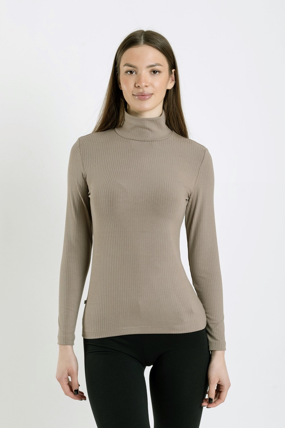 Джемпер женский на длинном рукаве с воротником-стойкой приталенного силуэта.