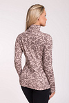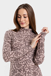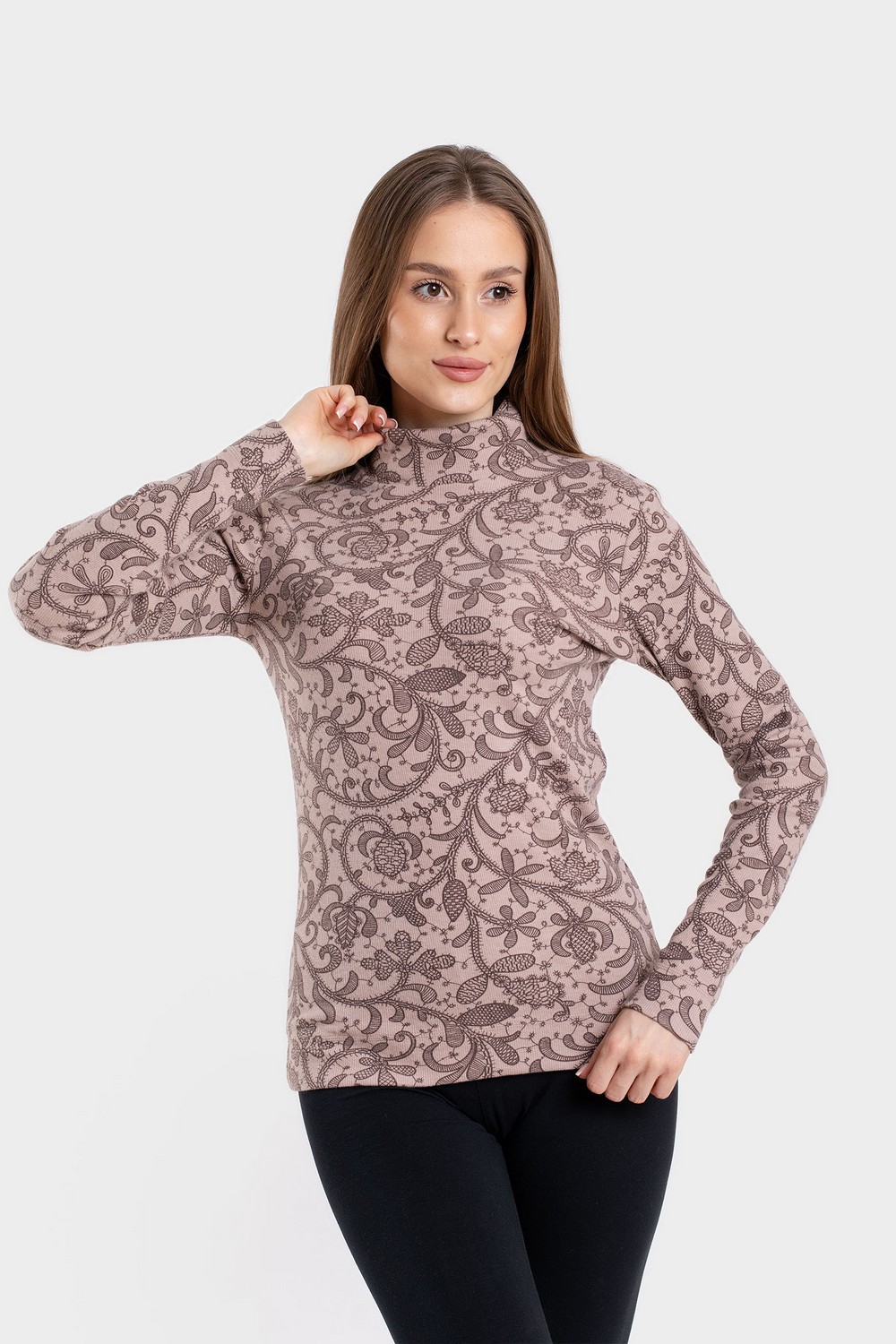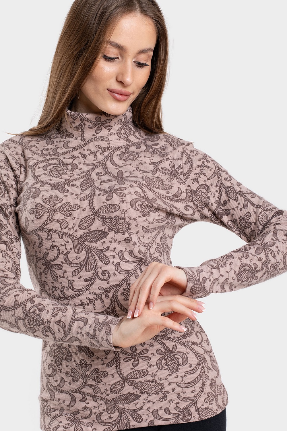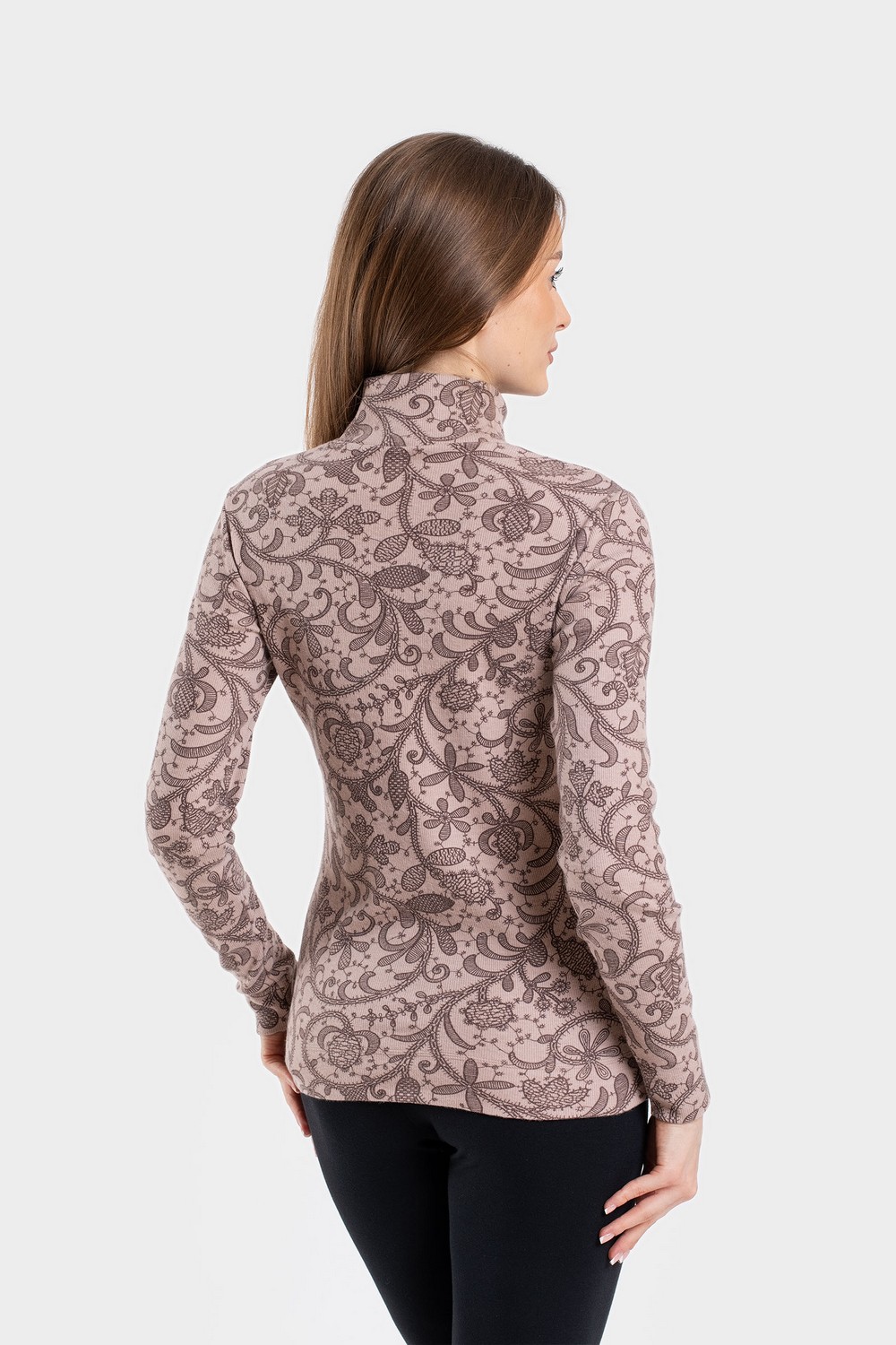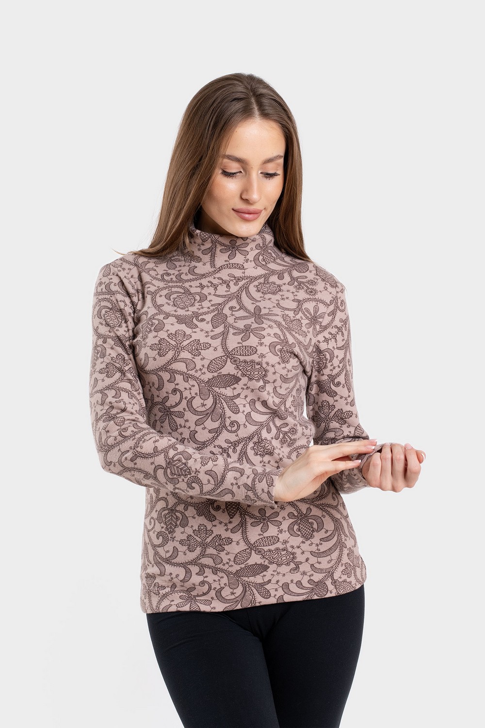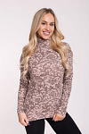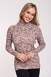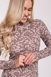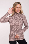 Женская водолазка, бадлон, гольф изготовлена из высококачественного трикотажного полотна кашкорсе. Наличие в его составе 72% натурального хлопка делают такое полотно гигроскопичным, «дышащим», гипоаллергенным. Изделие из него мягкое, приятное на ощупь, хорошо сохраняет форму и не вытягивается в процессе эксплуатации. Модель слегка приталенная, рукава полной длины, воротник-стойка высокий с отворотом. Наличие эластана и полиэстера в составе полотна, продуманная конструкция обеспечивают хорошую посадку по фигуре и свободу движений. Приятный оттенок кофейного цвета в сочетании с кружевным узором более темного оттенка придает изделию романтический вид. Прочные эластичные швы, текстурированные нити, специальные закрепки на швах – гарантия долговечности изделия при соблюдении правил по уходу за ним. Модель джемпер s9145