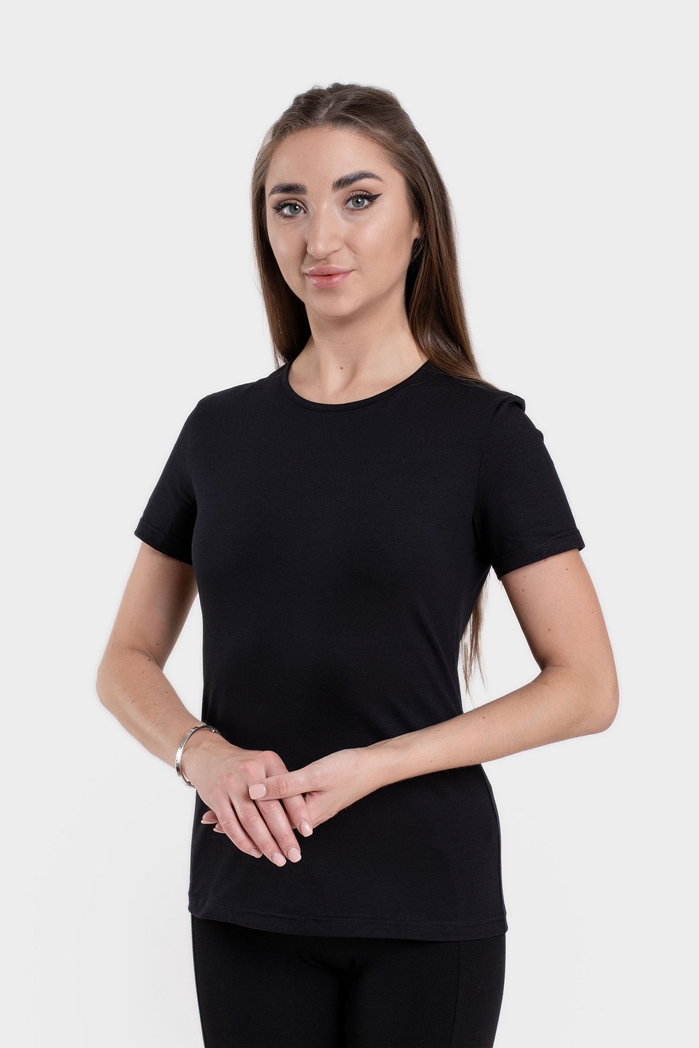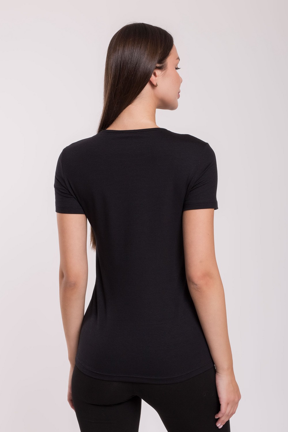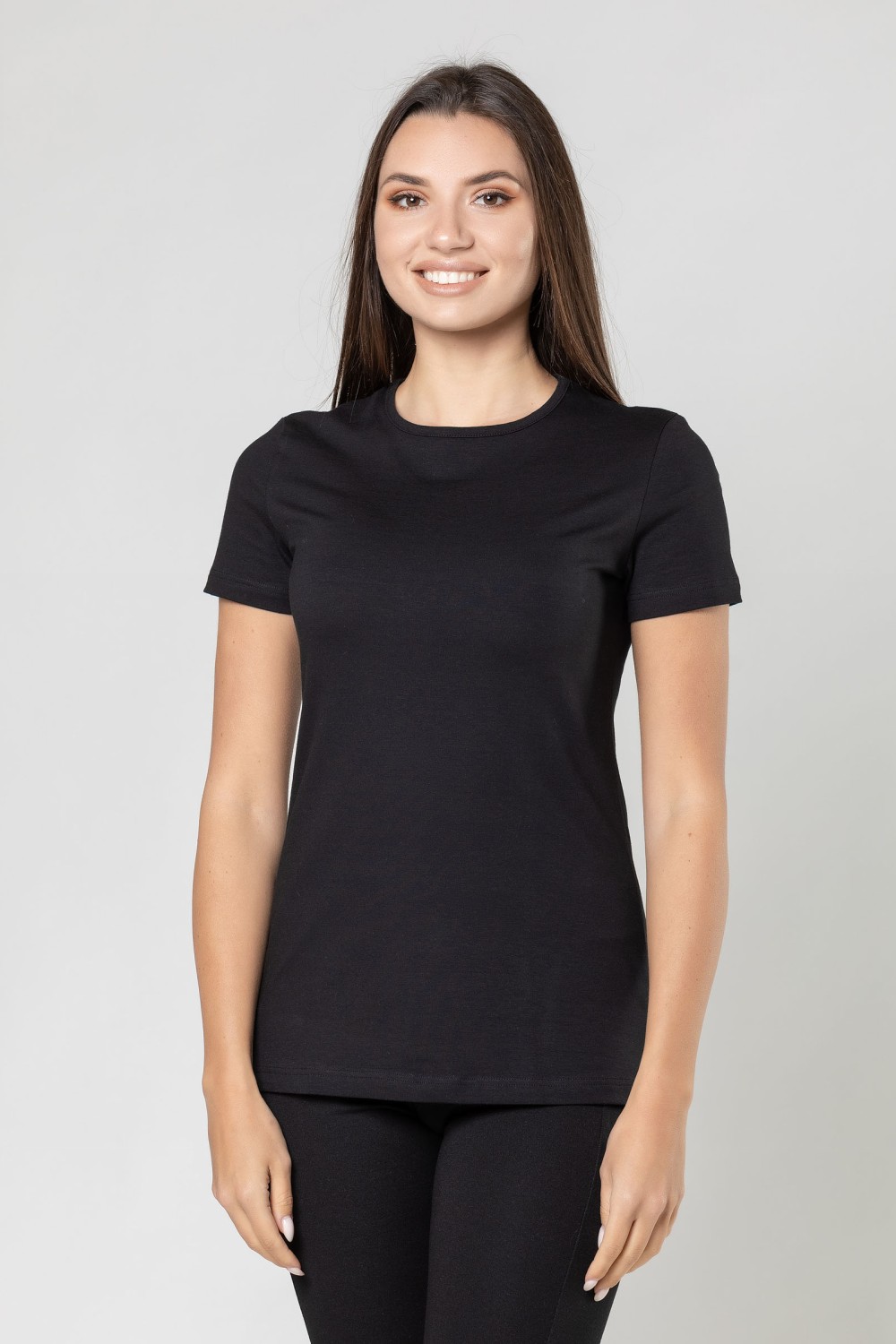 Классическая черная женская футболка с короткими рукавами и неглубоким круглым вырезом горловины, обработанным бейкой. Изготовлена из высококачественного хлопкового кулирного полотна пенье, содержащего 5% эластана. Модель полной длины, хорошо облегает фигуру, не стесняет движений, предназначена для повседневного использования. Полотно мягкое, комфортное, «дышащее», гигроскопичное, не вызывает аллергических реакций. Тщательно проработанная конструкция, прочность нити и специальные закрепки на швах, качественные безопасные красители гарантируют долговечность изделия при соблюдении правил по уходу за ним. Идеально подходит для занятий спортом и активного отдыха. Модель фуфайка s6321