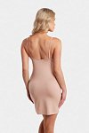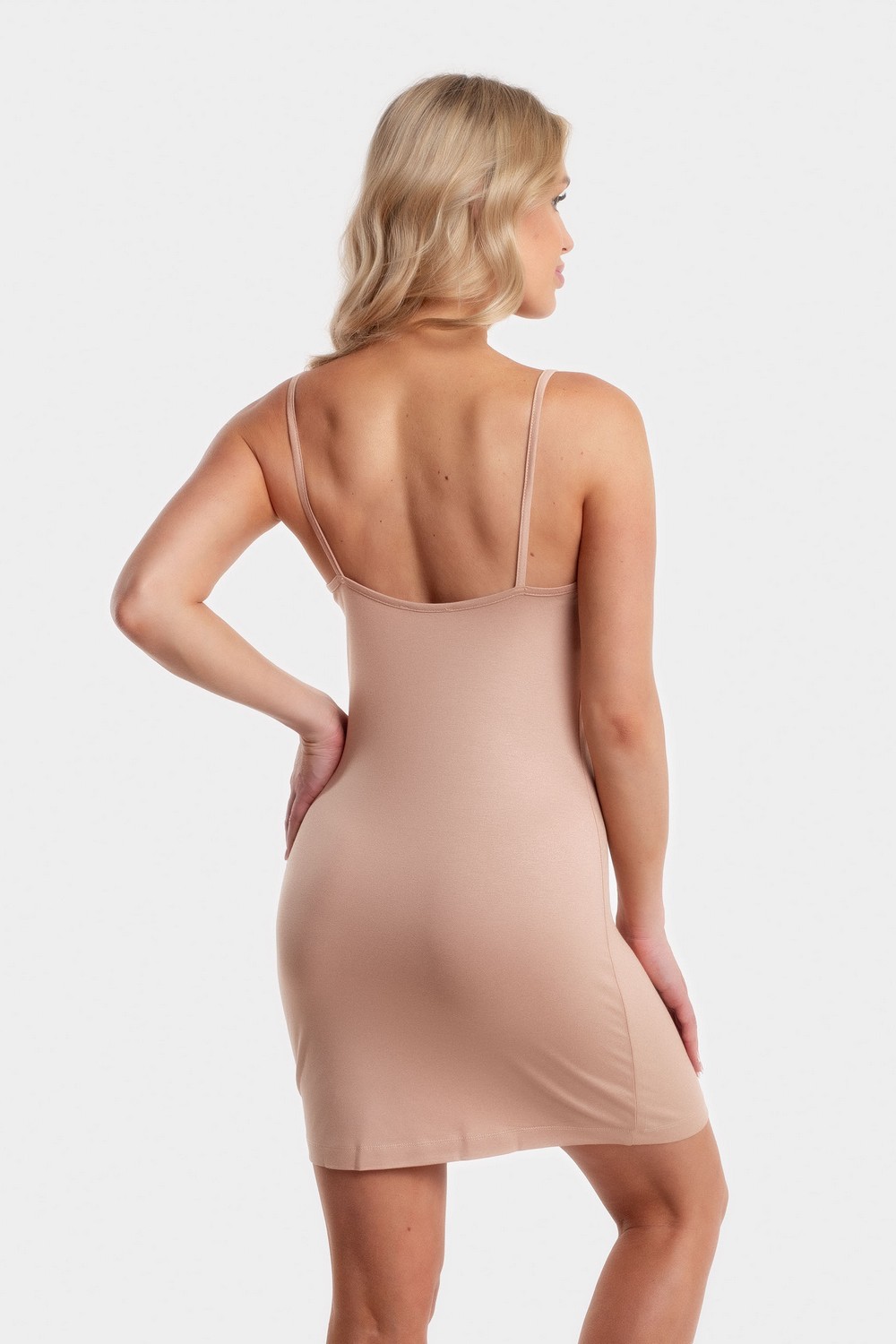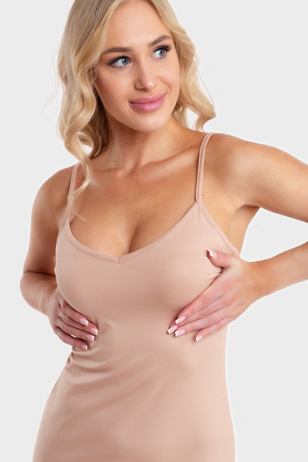 Телесная короткая вискозная трикотажная женская сорочка, комбинация на тонких бретелях. Изготовлена из высококачественного трикотажного кулирного полотна, содержащего 94% вискозы. Такое полотно не толстое, шелковистое на ощупь, отлично пропускает воздух, не вызывает аллергические реакции, гигроскопичное. Модель прилегающего силуэта, имеет боковые вытачки на груди. Бретели НЕ регулируются по длине. Верхние срезы сорочки и проймы обработаны бейкой из основного полотна. Нижний край обработан плоским швом вподгибку. Продуманный крой изделия и наличие эластана в составе полотна обеспечивают хорошую посадку по фигуре, не ограничивая свободу движений. Данная модель прекрасно подходит и для ночного отдыха, и для повседневного использования в качестве комбинации или чехла под платье. Эластичные швы, прочные нити и специальные закрепки – гарантия долговечности изделия при соблюдении правил по уходу за ним. Цвет телесный. Модель сорочка s8654