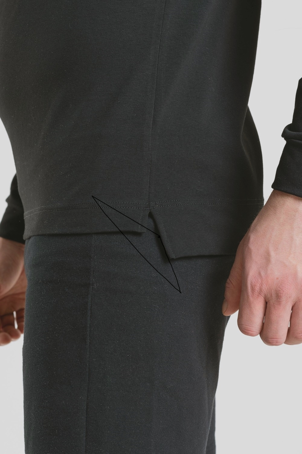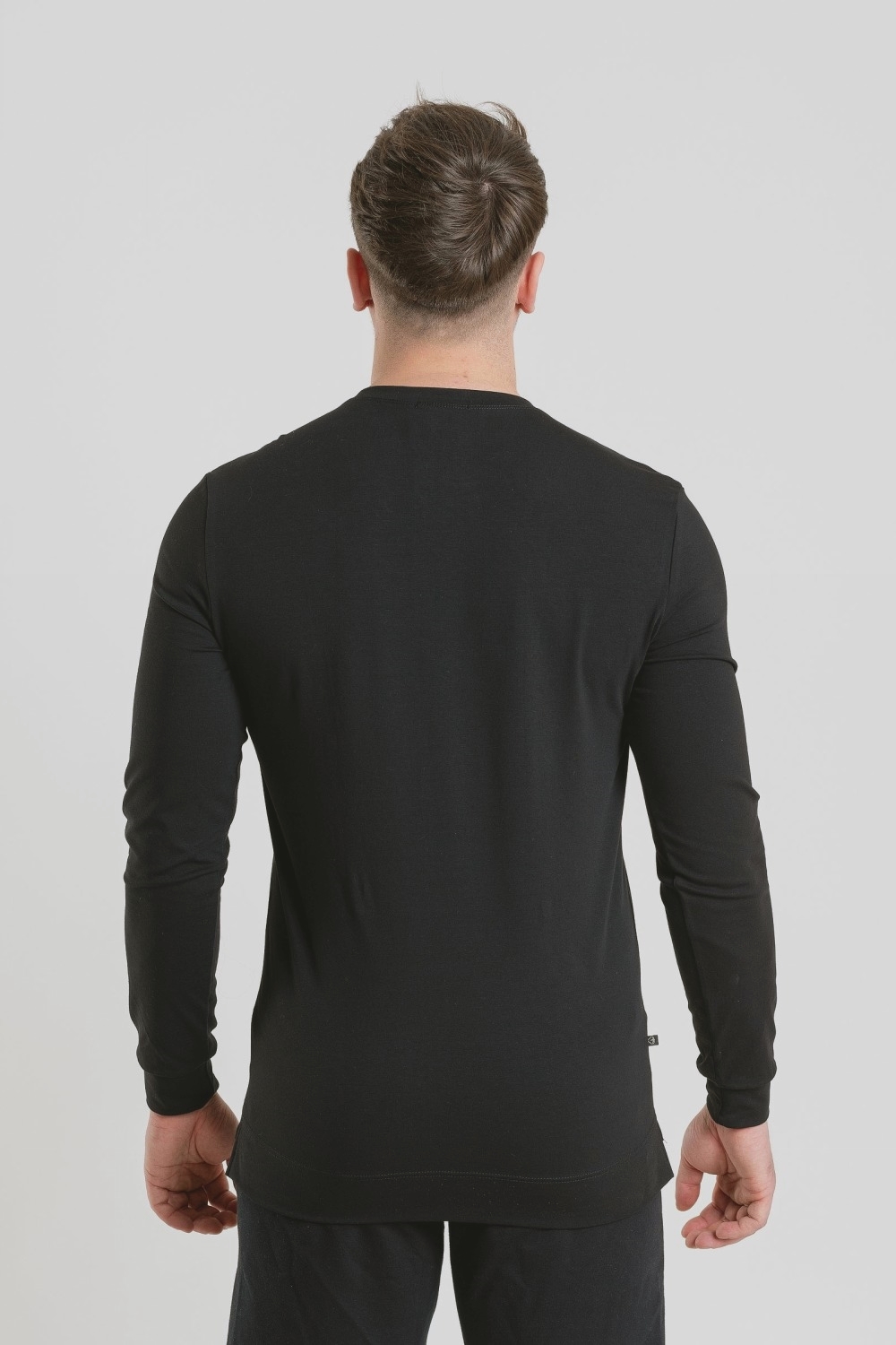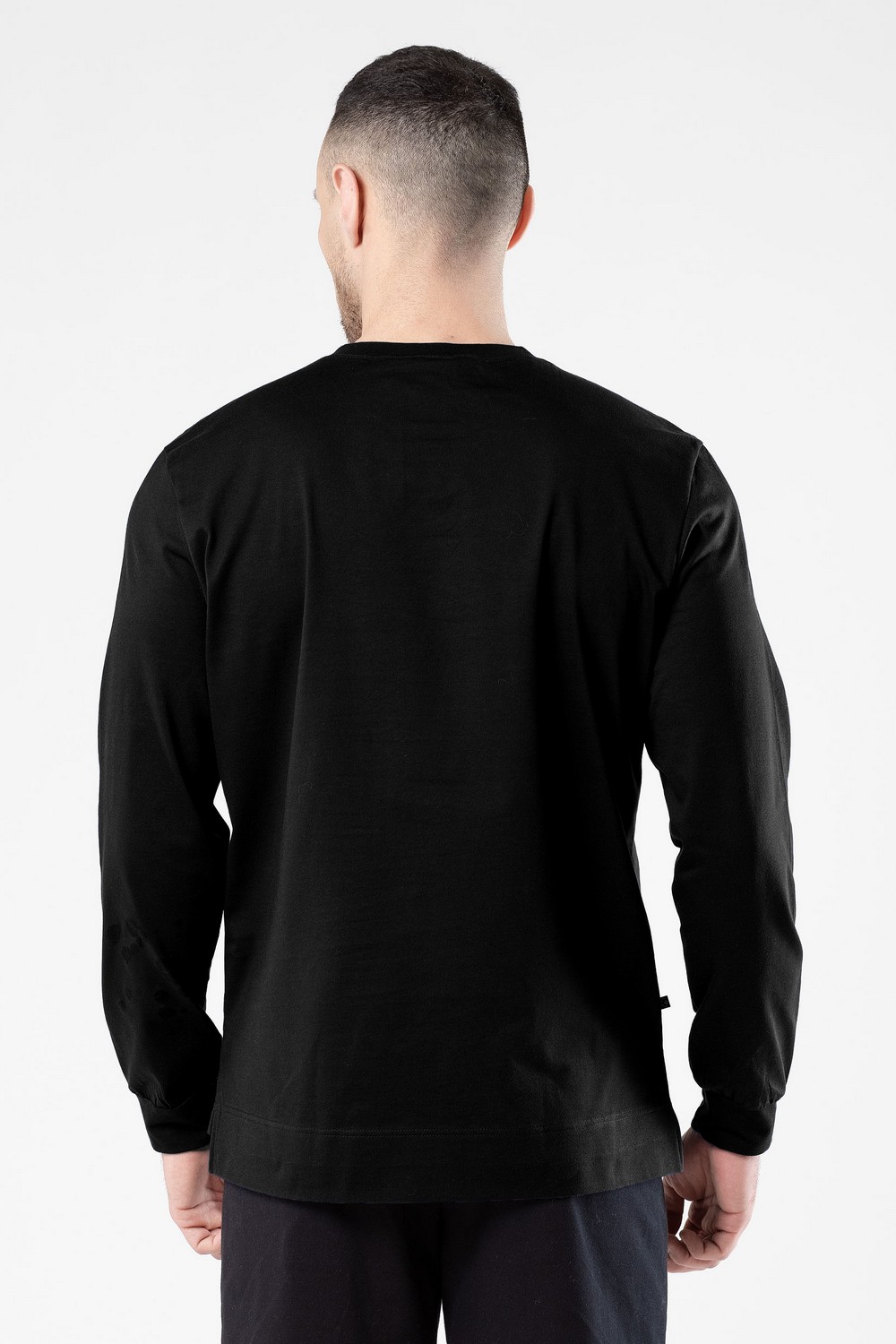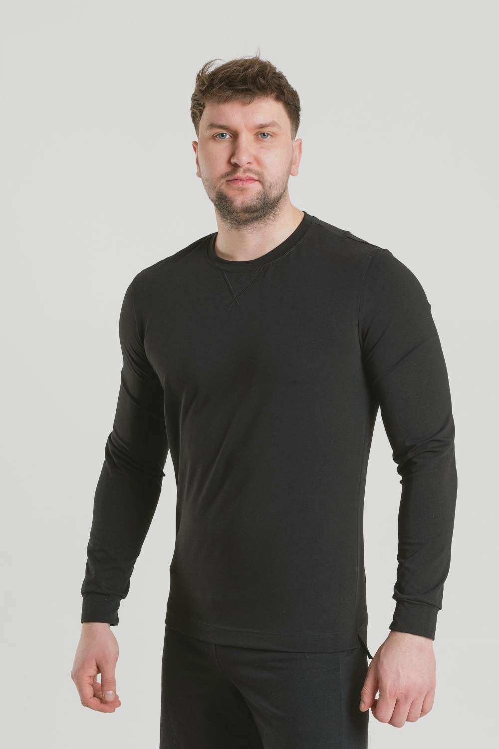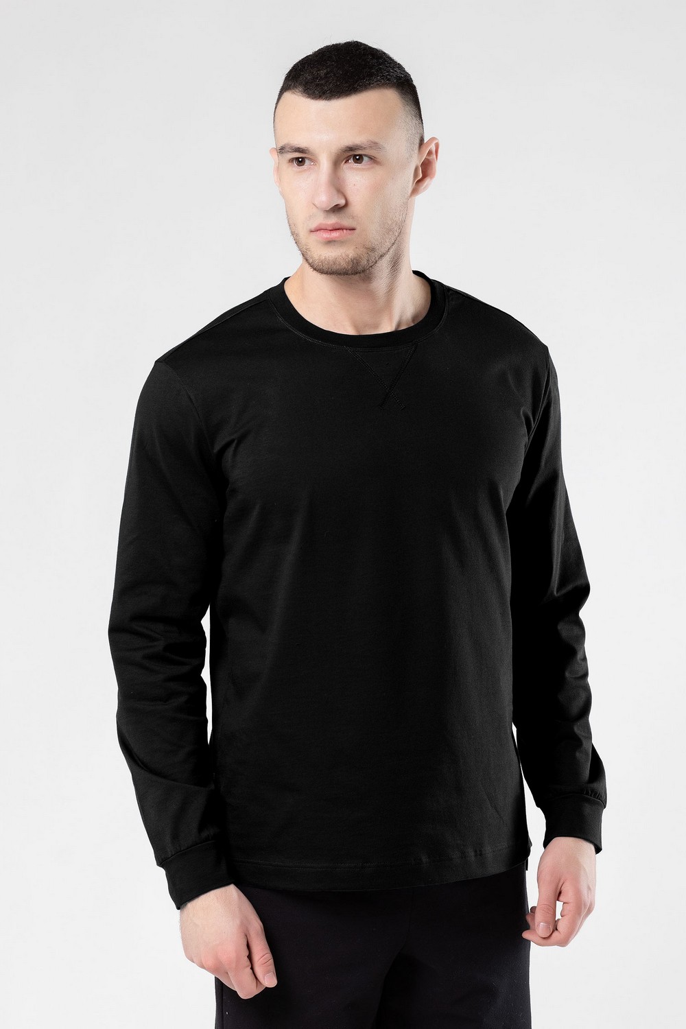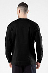Классический черный мужской лонгслив, фуфайка с длинными рукавами – базовая модель повседневного гардероба современного мужчины. Горловина круглая, под ней спереди небольшая декоративная отстрочка нитками в тон. Изготовлен из высококачественного трикотажного кулирного полотна с добавлением эластана. 95% хлопка – гарантия ежедневного комфорта, безопасности для здоровья и удобства в уходе за изделием. Тщательно проработанная конструкция и наличие эластана в составе полотна обеспечивают красивое облегание по фигуре, подчеркивая её достоинства. Модель можно использовать и как самодостаточный джемпер в сочетании с джинсами или брюками, так и в качестве белья первого слоя под толстовку или свитер в холодный сезон. Аккуратные прочные швы, эластичные нити высочайшего класса, безопасные красители – залог долговечности лонгслива при условии соблюдения правил по уходу, указанных на его ярлыке. Модель фуфайка s7555