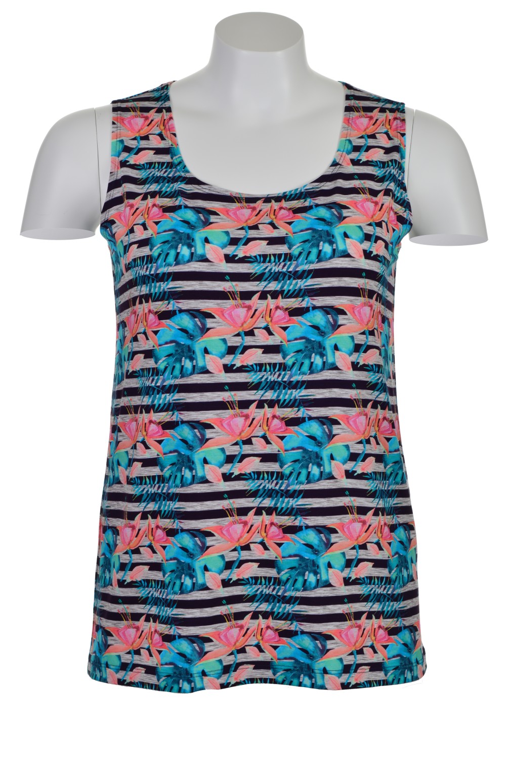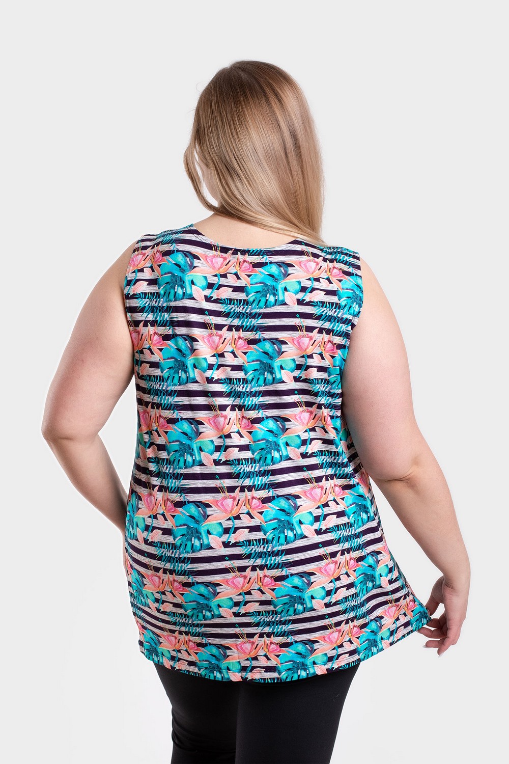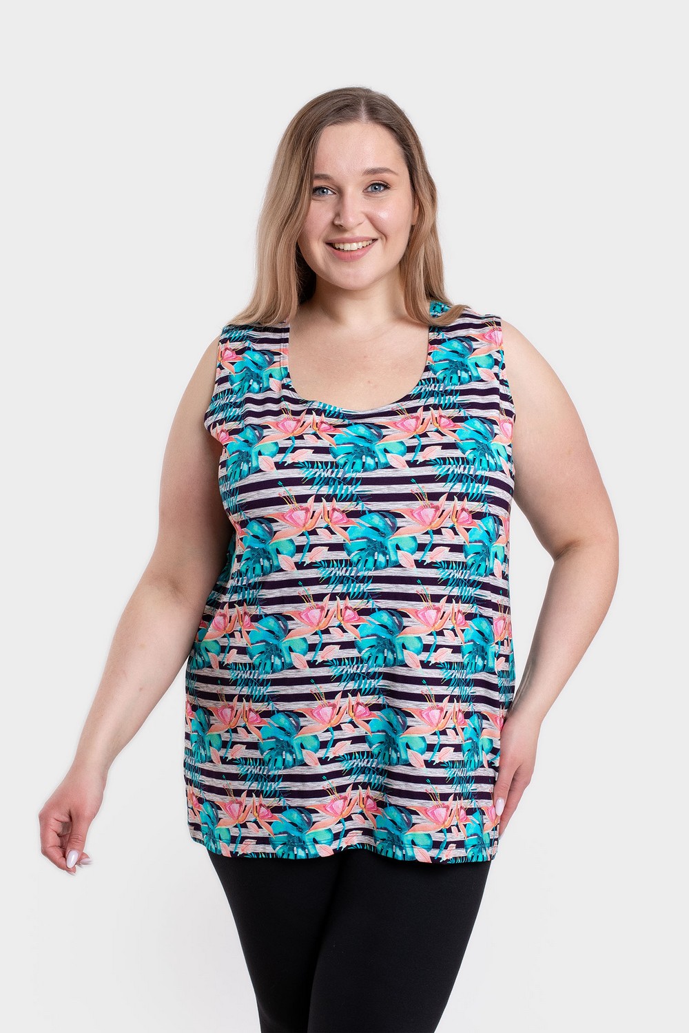 Универсальная вискозная трикотажная женская майка полуприлегающего силуэта с глубоким вырезом горловины. Шелковистое, мягкое, нежное трикотажное кулирное полотно, содержащее 95% вискозы, приятно к телу, не вызывает аллергических реакций, позволяет коже «дышать», а в летнюю жару создает ощущение прохлады. 5% лайкры делают его более стабильным и формоустойчивым. Простота и элегантность кроя, обработка всех срезов изделия плоскими швами вподгибку, свойства трикотажного полотна – всё это обеспечивает прекрасную посадку по фигуре. Модель подходит не только для лета, но и для зимы в качестве нательного белья под свитер или толстовку. Майка с цветочным принтом по полоске позволяет создать индивидуальный образ в комплекте с одеждой одного или нескольких оттенков её рисунка. Для сохранения формы и цвета майки необходимо соблюдать правила по уходу, указанные на ярлыке изделия. Модель майка а100813