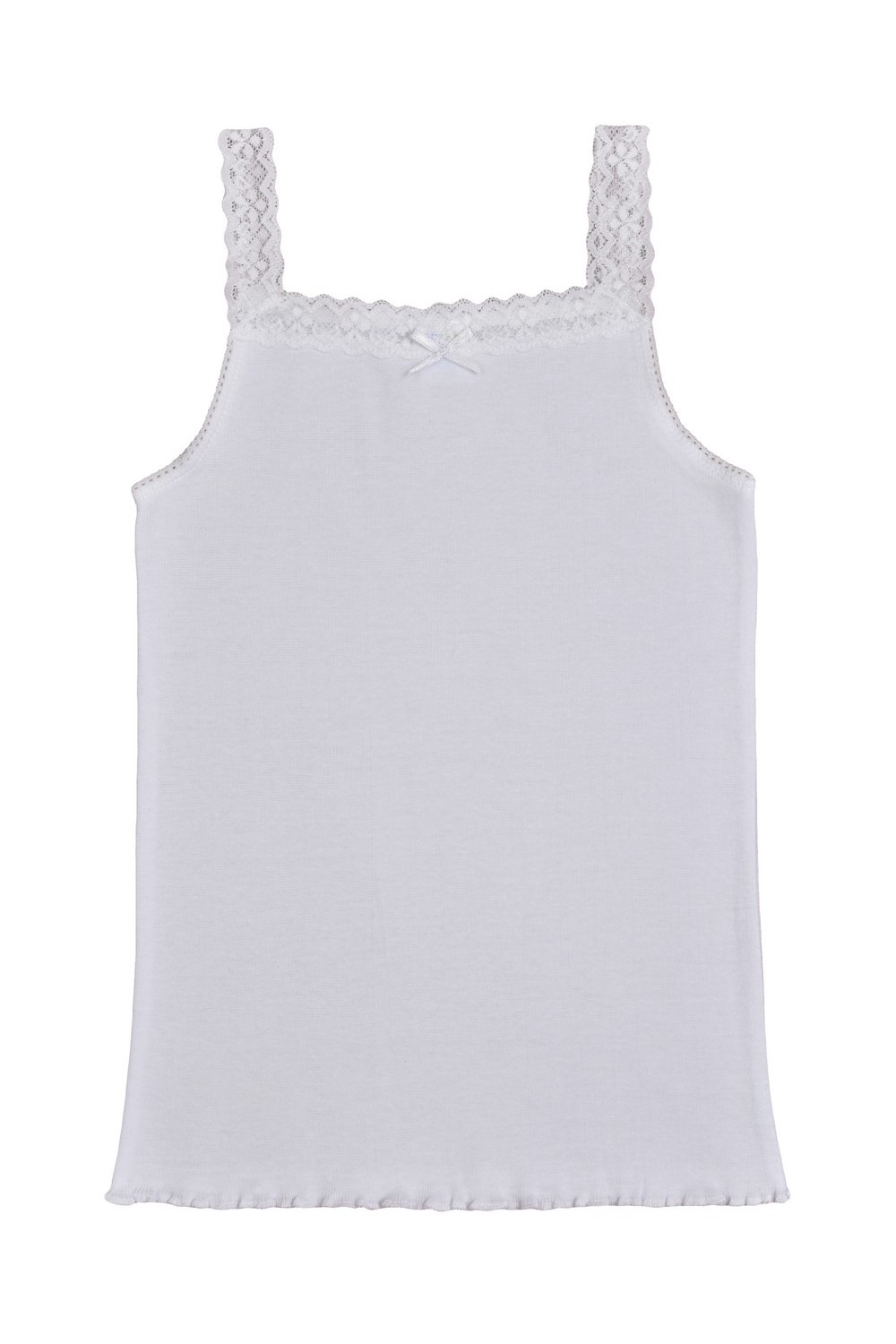 Бельевая майка для девочки от российской фабрики «ОЛЛА». Майка выполнена из мягкого, ластичного полотна, который хорошо растягивается в ширину. Состав полотна - 100%-ый хлопок, позволяющий изделию быть гипоаллергенным, гигроскопичным и приятным к телу. Срез верха передней полочки и бретельки - из мягкого эластичного кружева. Пройма и верхний срез спинки обработаны тонкой тесьмой-резинкой, пристроченной мягким плоским швом. Низ обработан на оверлоке роликовым швом. Майка украшена маленьким атласным бантиком.