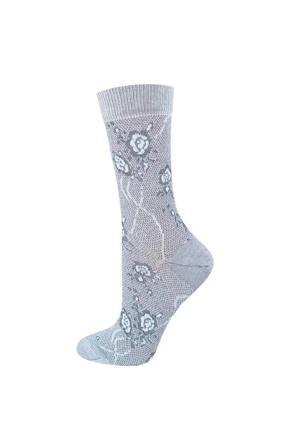 Код: 00122354 Коллекция: - Артикул: б1152 Состав полный: Хл 75%, Па 21 %, Мет 2%, Эл 2% Название: Носки жен,б1152,509(св.серый,сер-св,,люрекс светлые цветы), (23) Размер: 23