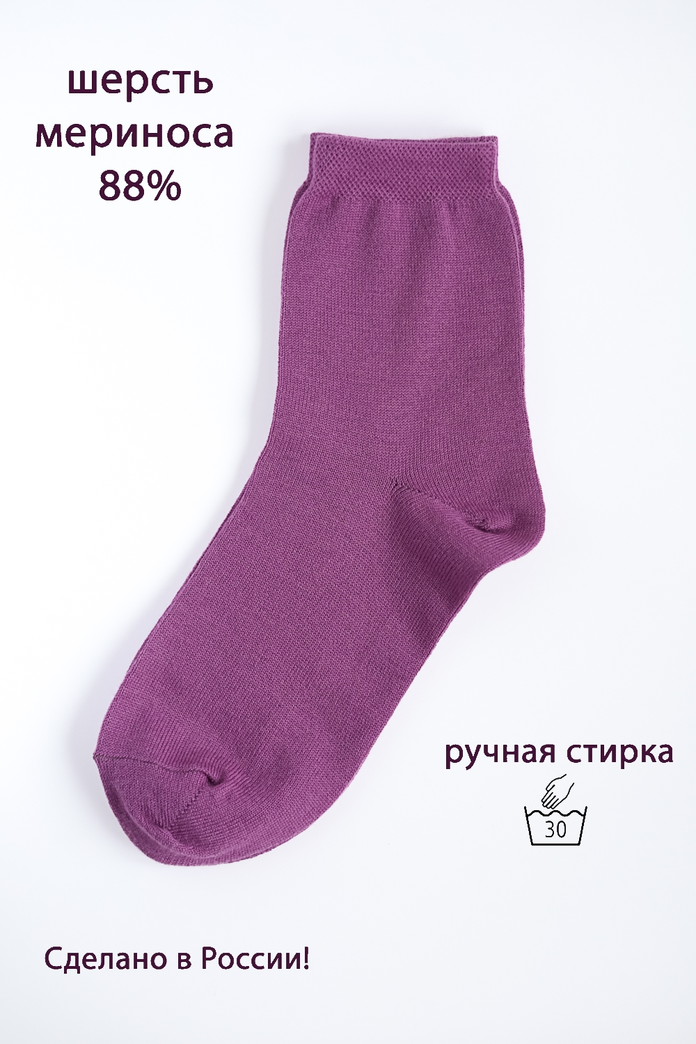 Теплые нетолстые шерстяные сиреневые женские термоноски компании 000 «Промэкс» (Смоленская область, Ярцево) - отечественного производителя чулочно-носочных изделий. Носки изготовлены из шерстяной мериносовой пряжи, которая произведена ведущим российским производителем трикотажной пряжи ООО «ВУЛКАМ» (Карачаево-Черкесская республика). В процессе производства пряжа не проходит операцию термоусадки, поэтому изделия из неё требуют обязательной РУЧНОЙ СТИРКИ! Шерсть мериносов обладает отличной паровоздухопроницаемостью, терморегуляцией, высокой гигроскопичностью, позволяющей изделию сохранять тепло даже во влажном состоянии, и гипоаллергенностью. Ланолин, которым богата мериносовая шерсть, предотвращает размножение бактерий и появление неприятного запаха. Носки отличаются высоким содержанием мериносовой шерсти - 88%, поэтому они очень теплые и уютные. После стирки шерсть распушается, становится ещё мягче и ее согревающие свойства усиливаются. Коллекция Меринос. Цвет аметист. Модель носки stmn 213
