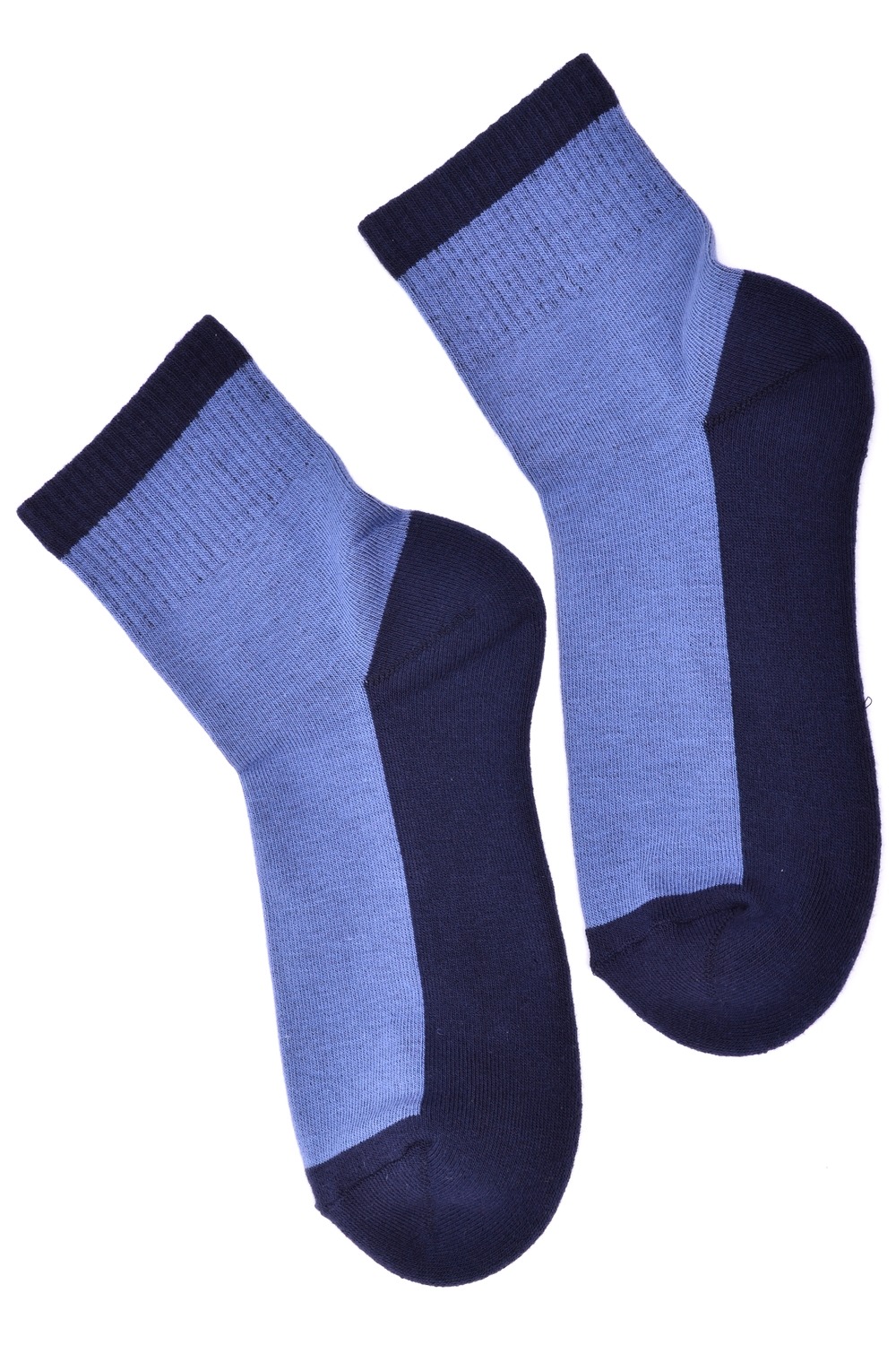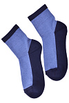 Любите утренние пробежки холодной поздней осенью? Чтобы вашим ногам было тепло и не тесно в любимых кроссовках, предлагаем эту модель мужских носков с укороченным паголенком. Двуцветные мужские носки согреют стопы, будут мягкими и комфортными благодаря махровому следу. Носки гладкие и приятные на ощупь. Махра вывязана только с изнаночной стороны стопы, что позволяет носкам смотреться презентабельно и не создавать дополнительный объём при надевании обуви. Сочетание серо-голубого (джинсового) и тёмно-синего цветов прекрасно подойдет к вашей спортивной одежде. При вывязывании верхней части паголенка использовано специальное переплетение нитей, дающее эффект резинки, поэтому при ходьбе или беге носки гарантированно не сползут вниз. Преобладающее содержание хлопка в составе носков способствует «дыханию» кожи и повышает их гигроскопичность. Полиэстер увеличивает срок службы носков, эластан обеспечивает прилегание к ноге. Плоский, аккуратный шов на мыске предохраняет пальцы от натирания.