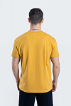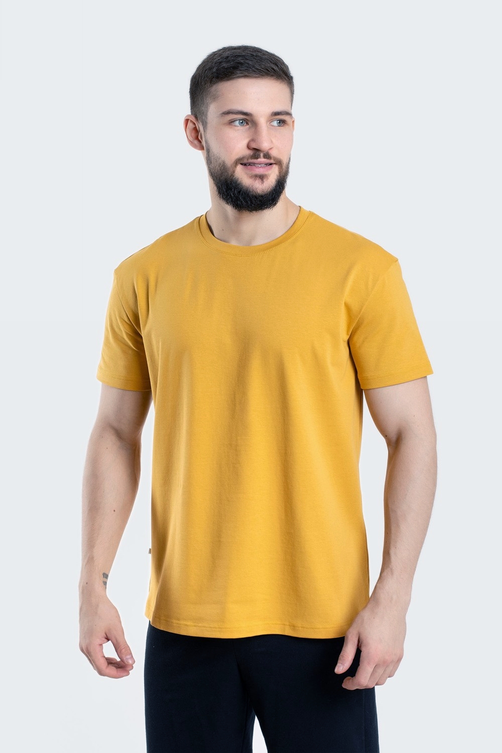 Яркая, горчичного цвета мужская футболка свободного кроя. Сшита из высококачественного кулирного полотна пенье, содержащего 95% натурального хлопка, который характеризуется высокой гигроскопичностью, воздухопроницаемостью, безопасностью для здоровья, гигиеничностью. Добавление эластана повышает прочность и формоустойчивость изделия. Удачная конструкция, надежные эластичные швы, текстурированные нити, специальные закрепки на швах - гарантия долговечности изделия при соблюдении правил по уходу за ним. Модель s7415