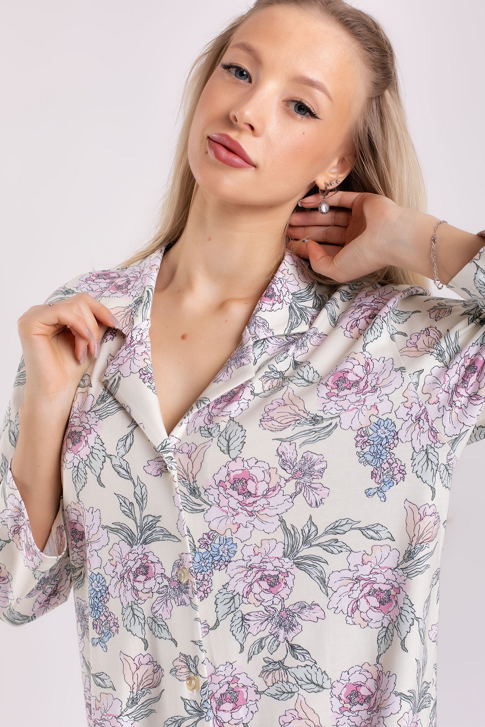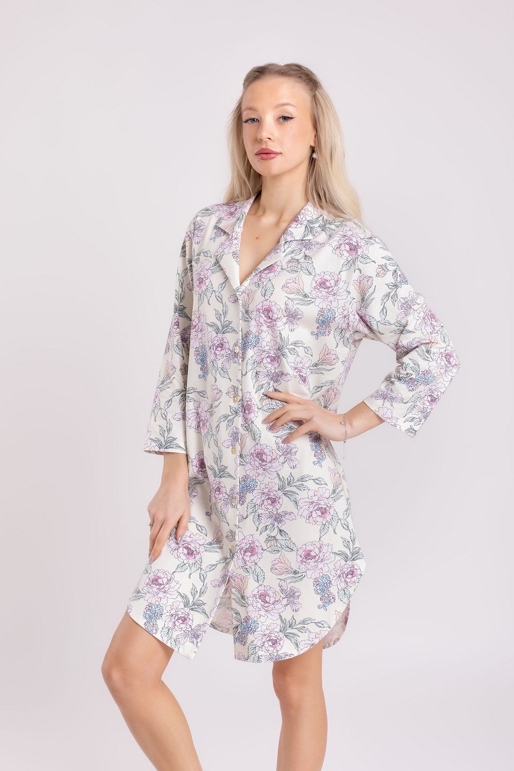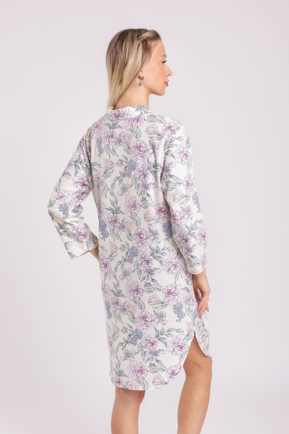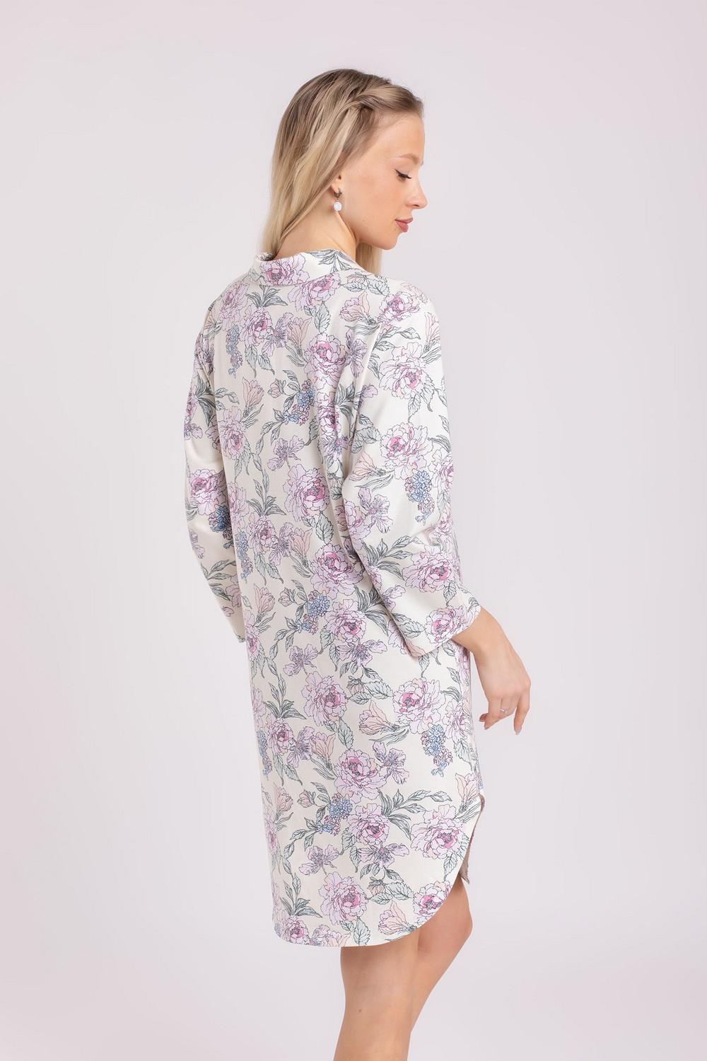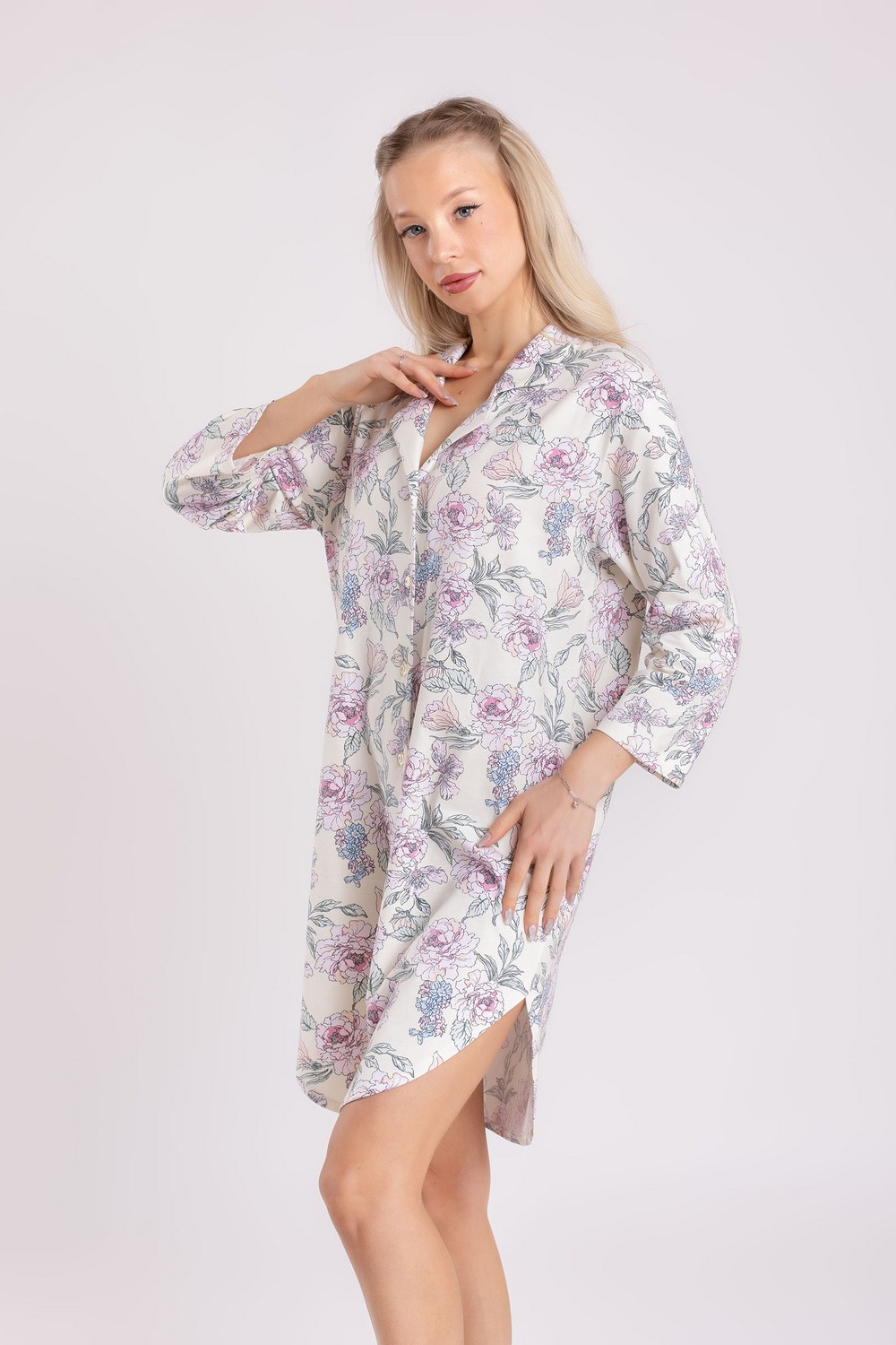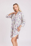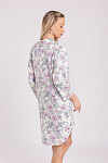 Короткий женский хлопковый трикотажный халат, платье для дома, длинная рубашка с отложным воротником, с застёжкой на пуговицах. Изготовлен из высококачественного кулирного полотна пенье с добавлением эластана. 95% натурального хлопка в его составе – это мягкое прикосновение к коже, ежедневный комфорт, гипоаллергенность и безопасность для здоровья. Модель свободная, прямого кроя, без карманов. Рукава втачные, длина «семь восьмых». Низ изделия фигурный, с овальным контуром. Романтичный цветочный рисунок в розово-коралловых, голубых и зеленых оттенках на молочном фоне платья придает изделию изысканный вид. Прочные эластичные швы, текстурированные нити и специальные закрепки на швах – гарантия долговечности изделия при соблюдении правил по уходу за ним. Модель халат s6880