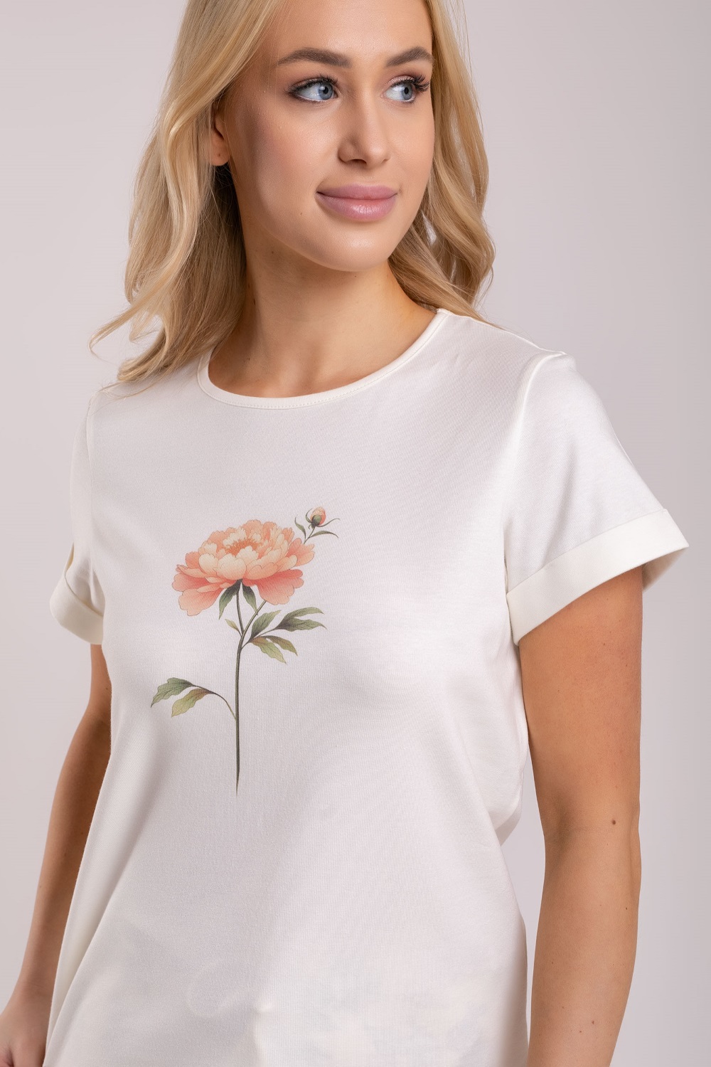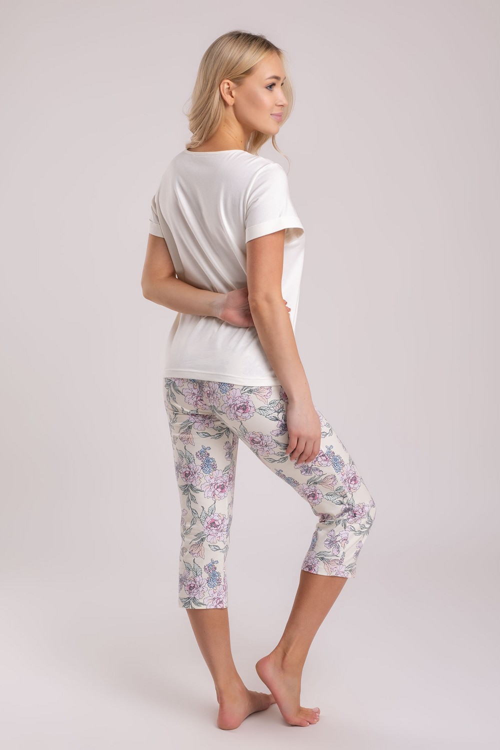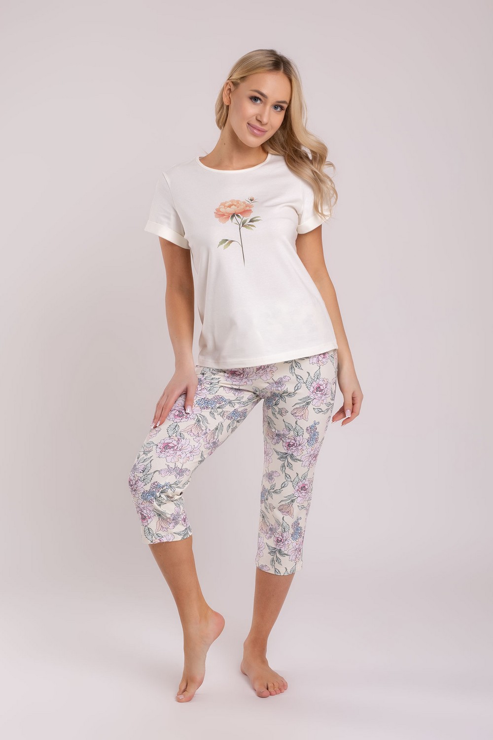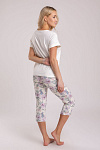 Хлопковая трикотажная женская пижама с коротким рукавом и бриджами. Трикотажное кулирное полотно пенье, содержащее 95% натурального хлопка, гигроскопичное, воздухопроницаемое, гипоаллергенное, мягкое и шелковистое на ощупь. Молочная футболка прямого покроя, с круглой горловиной и нежным рисунком цветка спереди, нанесенным способом цифровой печати, поэтому он мягкий и устойчив к механическим воздействиям. Однако, чтобы сохранить его цвет, необходимо перед стиркой изделие вывернуть на изнанку. Бриджи поддерживают растительную тематику, обозначенную на футболке. Высококачественное полотно, тщательно проработанная конструкция, безопасные красители, прочные швы – залог длительной эксплуатации изделия при соблюдении правил по уходу за ним. Модель пижама s5322