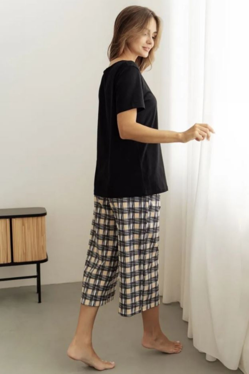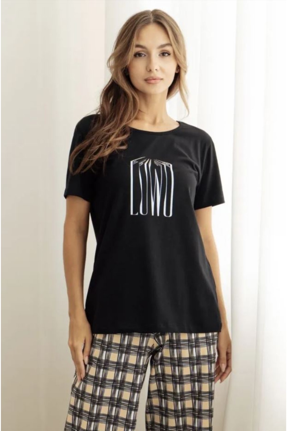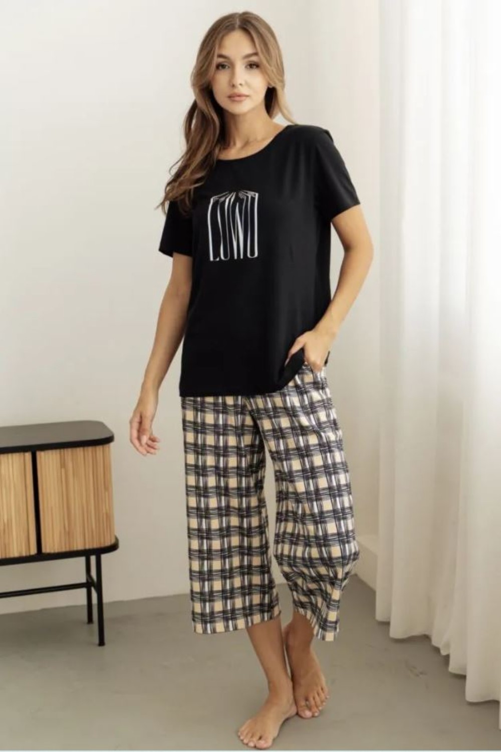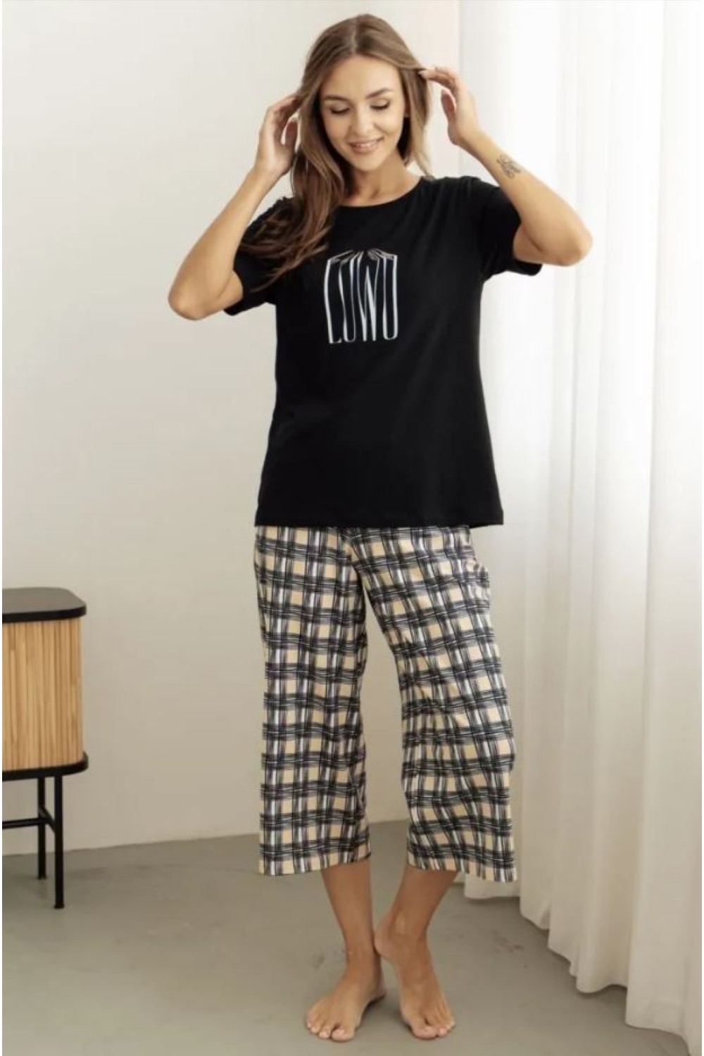 Код: 00115977 Коллекция: Mokko Артикул: 20259/53010 Состав полный: Хл 95%, Эл 5% Название: Костюм жен,20259/53010,1h-911.1092/1h-(черный/песочный,чер,беж,книги клетка), (44-170) Размер: 44 Рост: 170