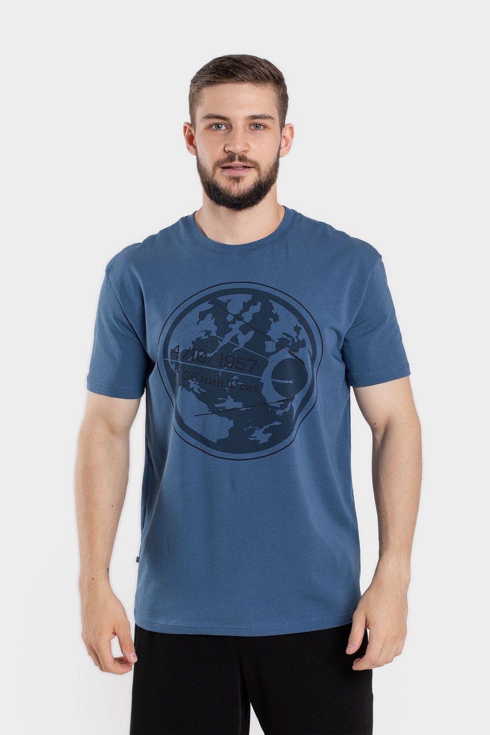 Мужская футболка, фуфайка, джемпер цвета индиго с тематическим принтом на тему «спутник Земли» – сувенирное изделие, подарок родственникам и друзьям, и просто эффектный элемент вашего образа. Футболка с выразительным и, в то же время, сдержанным по цвету рисунком, посвящённым запуску первого спутника Земли, - не просто подарок, а практичная удобная и комфортная вещь повседневного гардероба, так как изготовлена из высококачественного кулирного трикотажного полотна пенье с добавлением эластана. 95% натурального хлопка в составе полотна – это комфорт и безопасность для вашего здоровья на протяжении всего дня. Хлопок обладает отличной гигроскопичностью, воздухопроницаемостью, гипоаллергенностью и приятен для тела. Футболка силуэта RegularFit – классическая модель с прямыми лекалами. Футболка сохранит свои форму и цвет при соблюдении правил по уходу за трикотажными изделиями. Цвет индиго (пантон 19-4026). Модель джемпер s7415