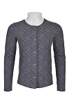 Серый пиджак, жакет в клеточку для девочки. Изготовлен из тонкого, но плотного хлопкового футерованного полотна без начеса. Модель прямого силуэта, без воротника, спереди застегивается на пуговицы. Модель жакет р822674