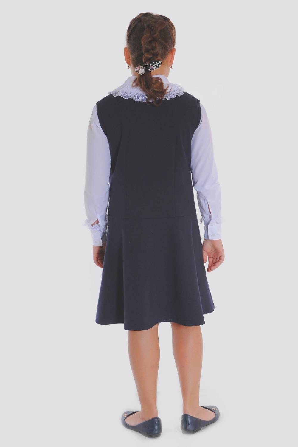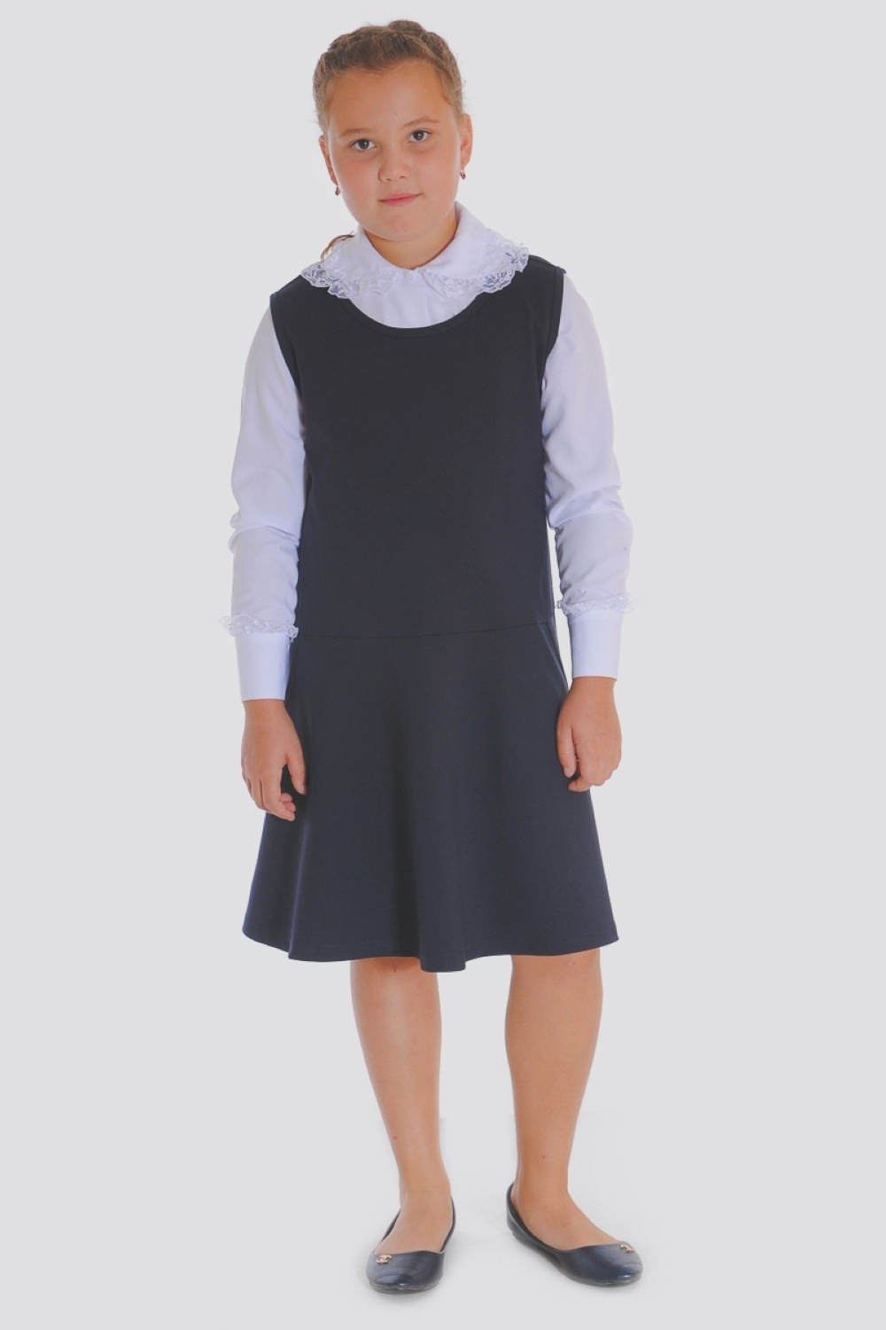 Синий сарафан для школы – комфортная форменная одежда для ученицы. Изготовлен из трикотажного полотна, содержащего 68% вискозы. Модель разработана с учетом требований к школьной одежде, поэтому очень удобная и не ограничивает свободу движений девочки в процессе учебы и отдыха. Сарафан прекрасно комплектуется с блузкой или водолазкой любого цвета. Изделие практично и сохраняет свои характеристики при соблюдении требований по уходу, указанным на его ярлыке. Модель сарафан 15-1140