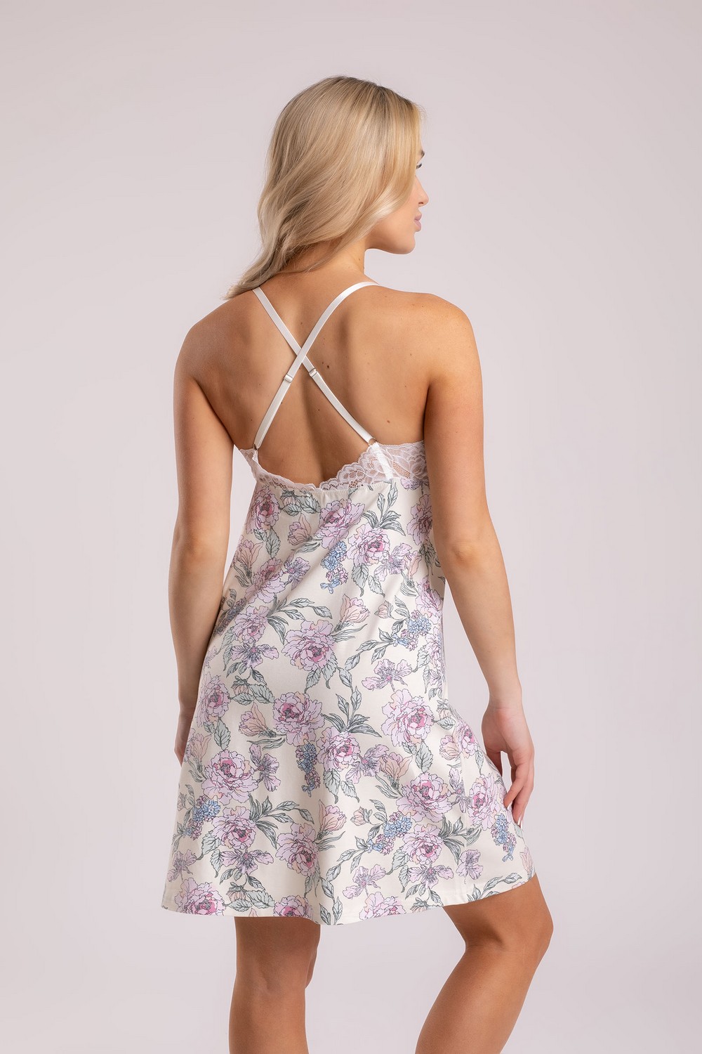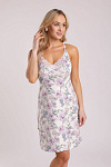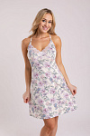 Нарядная хлопковая трикотажная женская ночная сорочка, комбинация с отделкой из кружева. Изготовлена из высококачественного кулирного полотна, содержащего 92% натурального хлопка, характеризующегося приятными тактильными свойствами, хорошей гигроскопичностью и воздухопроницаемостью. Модель полуприталенного силуэта, с перекрещивающимися на спинке узкими бретелями. Бретели регулируемые, выполнены из эластичной тесьмы молочного цвета. Фурнитура прочная, металлическая. Лиф отрезной, однослойный, с защипами по нижнему срезу для обеспечения необходимого объёма на грудь. Верхние кромки лифа и спинки украшены нежным белым кружевом. Нижний срез изделия обработан плоским швом вподгибку. Романтичный цветочный рисунок в розово-коралловых, голубых и зеленых оттенках на молочном фоне сорочки придает изделию изысканный вид. Прочные эластичные швы, текстурированные нити и специальные закрепки на швах – гарантия долговечности изделия при соблюдении правил по уходу за ним. Модель сорочка s8674,s8648