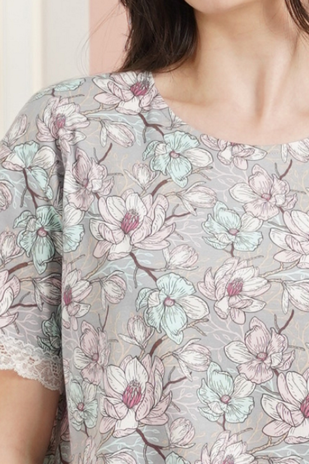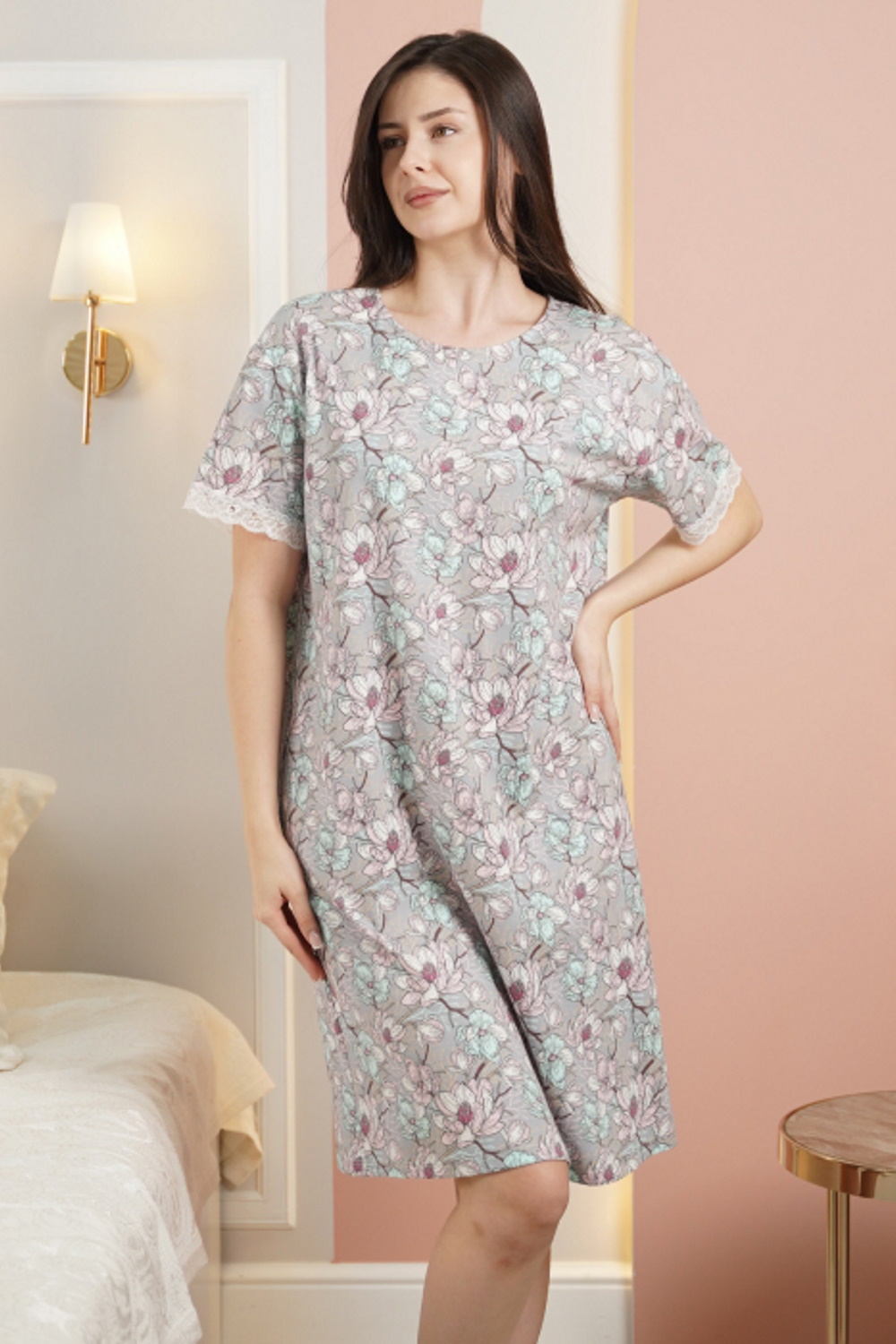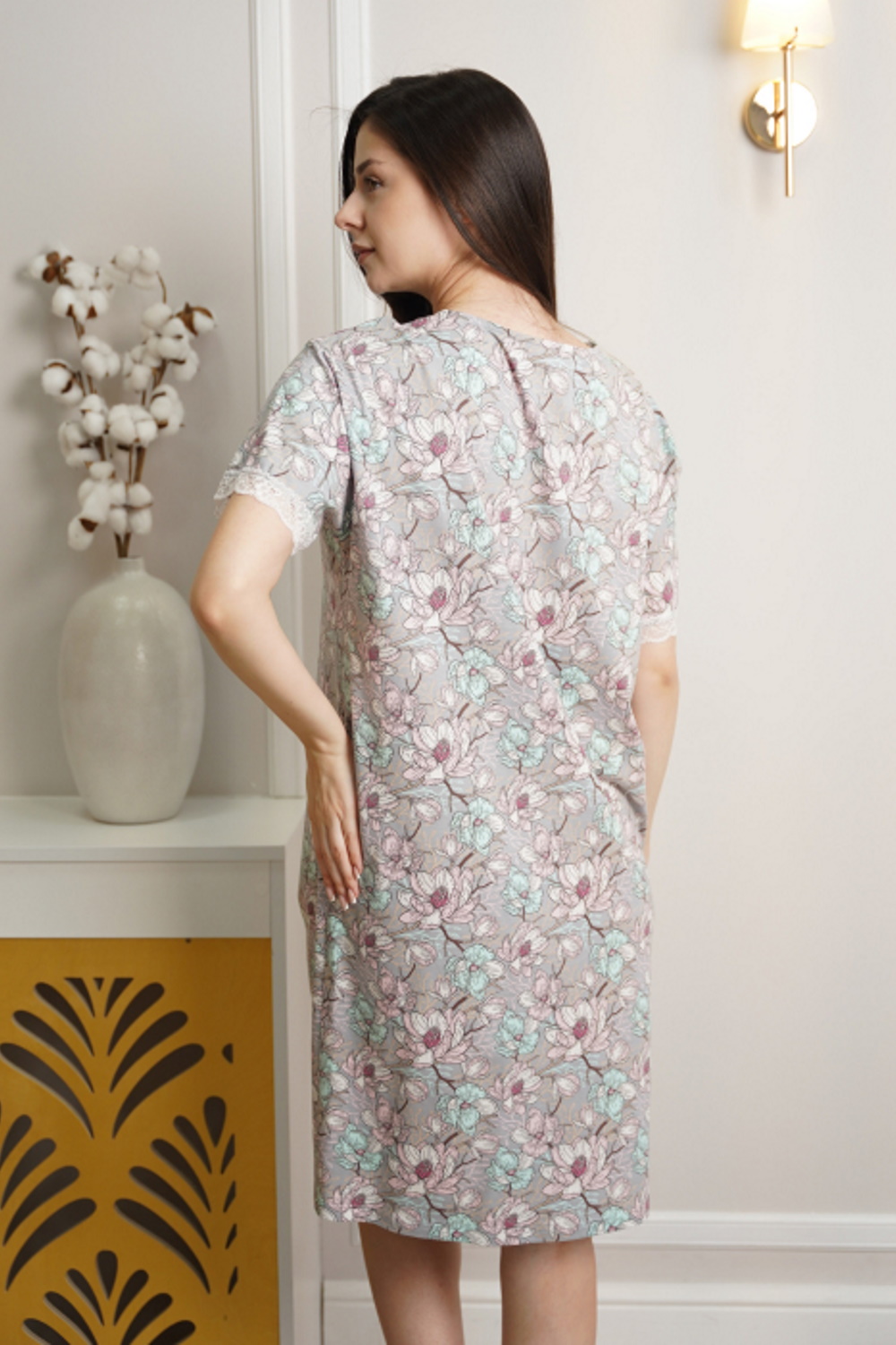 Хлопковое трикотажное женское платье, серого цвета с цветочным рисунком. Изготовлено из высококачественного кулирного полотна пенье, тонкого (но не рыхлого), лёгкого, очень приятного на ощупь. 100% натурального хлопка – это высокая воздухопроницаемость, гигроскопичность, гипоаллергенность, безопасность для здоровья, комфорт и простота ухода за изделием. Модель без карманов, с круглой горловиной. Рукав короткий, нижний край обработан мягким узким кружевом. Изделие можно использовать и как удобное домашнее платье, и как ночную сорочку. Изделие сохранит неизменными свои форму и цвет при соблюдении правил по уходу, указанных на его ярлыке. Модель сорочка 654228