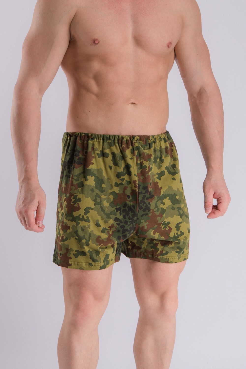 Свободные трусы шортами, или «семейники», - излюбленная и популярная модель мужского нижнего белья на всей территории нашей необъятной страны и ближнего зарубежья. В них спят, в них дефилируют по дому или на даче в жару, когда «никто не видит», в них ходят на работу, надев сверху классические брюки. Их популярность вполне заслужена, т.к. они сшиты из гигроскопичного «дышащего» хлопкового трикотажного полотна, которое безопасно для здоровья и не создает «парниковый» эффект в зоне мужского достоинства. Трусы из тонкой набивной кулирки, свободного кроя, средней длины. По талии вставная регулируемая резинка, гульфика нет, ластовица двойная. Две основные детали торса соединены вертикальными стачными швами, находящимися спереди и сзади по центру. Края штанин обработаны плоскими швами вподгибку. Набивка «камуфляж» в оттенках зеленого и коричневого цветов долго не поблекнет при соблюдении правил по уходу за трикотажными изделиями.
