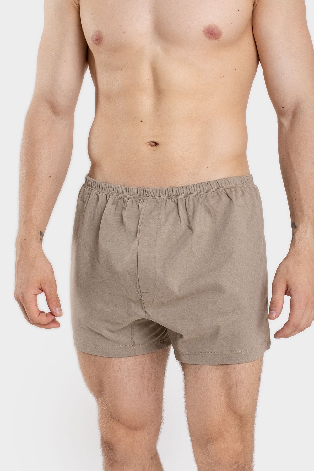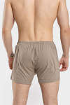 Однотонные бежевые мужские классические свободные «дышащие» трусы-шорты средней длины и среднего объёма. Модель изготовлена из гладкокрашеного кулирного трикотажного полотна класса пенье. 100% хлопка в его составе – это гигроскопичность, воздухопроницаемость и комфортность белья. Обработка по талии швом вподгибку с тесьмой-резинкой. Ластовица широкая, двойная. Нижние срезы подшиты плоскими швами. Две детали переда по центру изделия образуют ложный гульфик. Задняя деталь трусов соединена с передними половинками двумя боковыми стачными швами. Трусы предназначены для повседневного использования, легко стираются, гладятся и сохраняют свои форму и цвет при соблюдении требований по уходу за трикотажными изделиями. Модель трусы а5030128