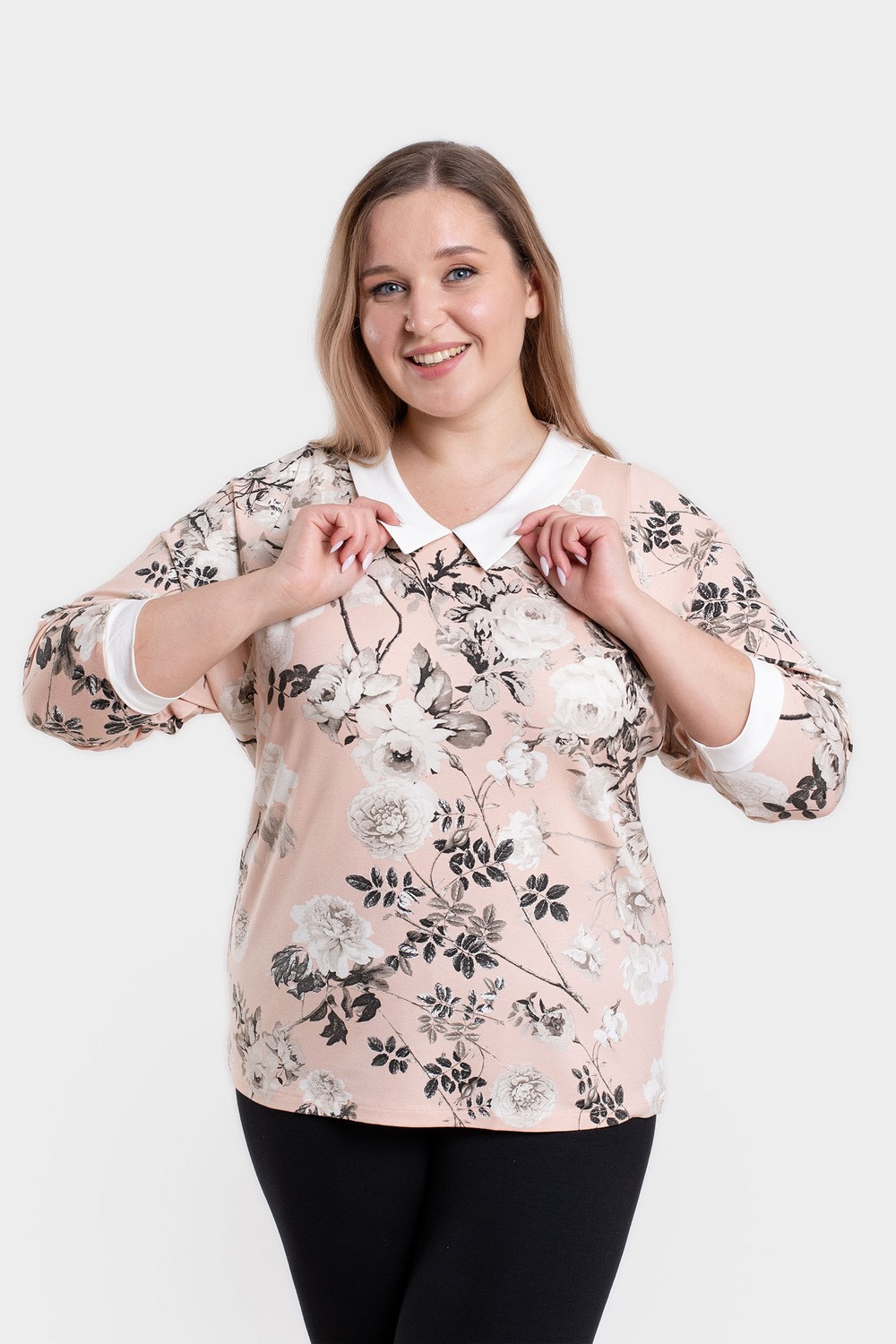 Нарядная вискозная женская блузка, кофточка с белыми воротником и манжетами. Рукава ¾, втачные, напоминают по конструкции форму «летучая мышь», благодаря чему блузка имеет свободную посадку в области груди. Наличие 95% вискозы в составе полотна обеспечивает хорошую воздухопроницаемость и гигроскопические свойства джемпера, не вызывает аллергию и не раздражает кожу. Цветочный рисунок добавит женственности и романтичности вашему образу. Соблюдение инструкции по уходу за изделием надолго продлит срок службы кофточки на радость своей владелице. Модель джемпер а130512