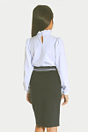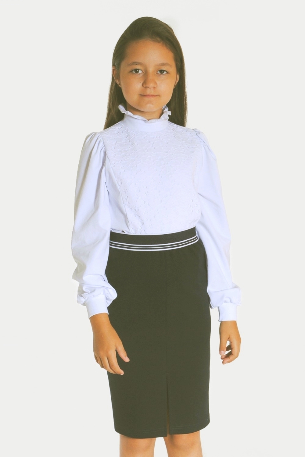 Нарядная белая водолазка с длинными рукавами для девочки. Изготовлена из трикотажного кулирного полотна, содержащего в равных количествах хлопок и вискозу, обладающих высокой гипоаллергенностью, гигроскопичностью, мягкостью и эстетичным внешним видом. Незначительная добавка эластана обеспечивает формоустойчивость изделия и хорошую посадку по фигуре. Спереди модель украшена ажурной вставкой из эластичного кружева, которая наложена вторым слоем поверх полотна основы. Воротник-стойка, декорированный рюшей, сзади застегивается на две пуговки. Водолазку необходимо стирать в режиме деликатной стирки при температуре 30 градусов. Модель водолазка 71-178