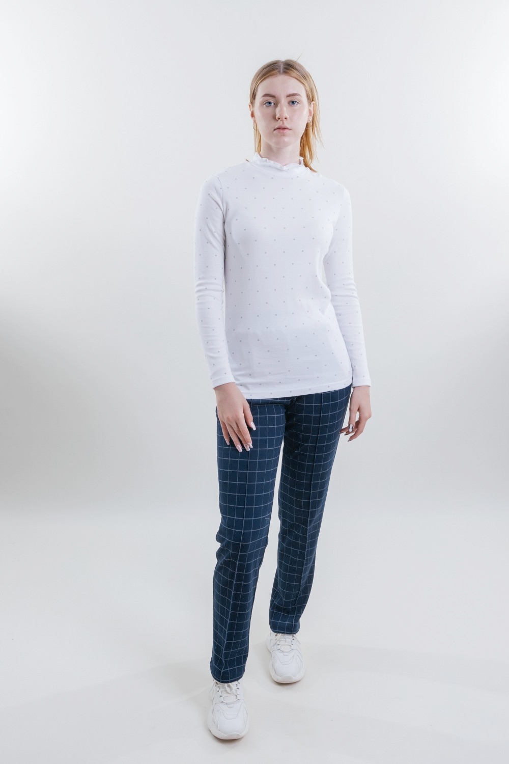 Белая хлопковая водолазка с длинными рукавами для девочки. Изготовлена из высококачественного трикотажного полотна ластик, содержащего 100% натурального хлопка, который обеспечивает лёгкое дыхание кожи, ежедневный комфорт и абсолютную безопасность для здоровья. Модель облегающего силуэта, воротник-стойка без отворота. Волнообразная кромка воротника, обработанная оверлочным швом с растяжением, и светло-серый горошек по белому фону придают водолазке романтичный вид. Изделие сохранит свои характеристики и белый цвет при соблюдении правил по уходу за ним. Модель джемпер в815444