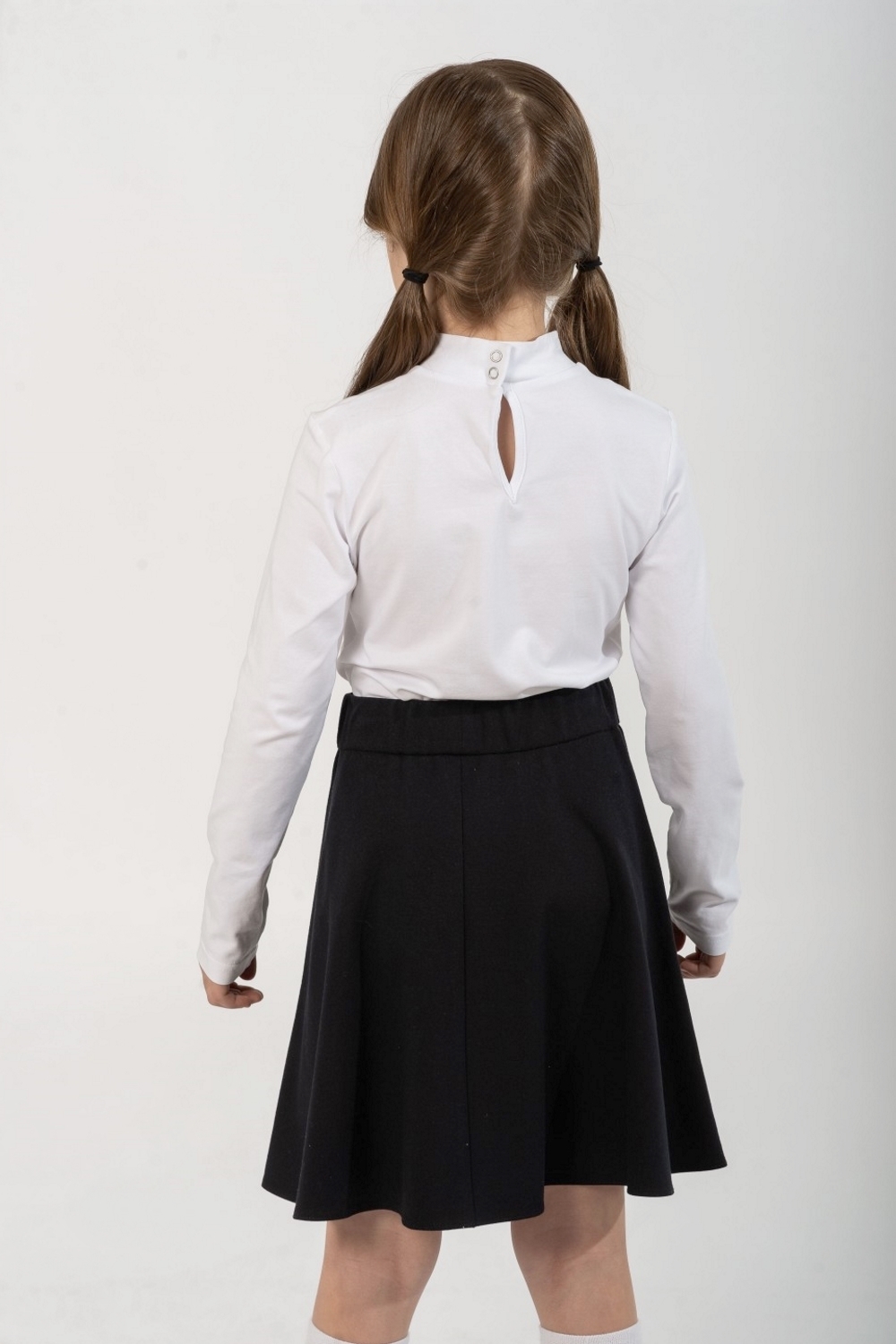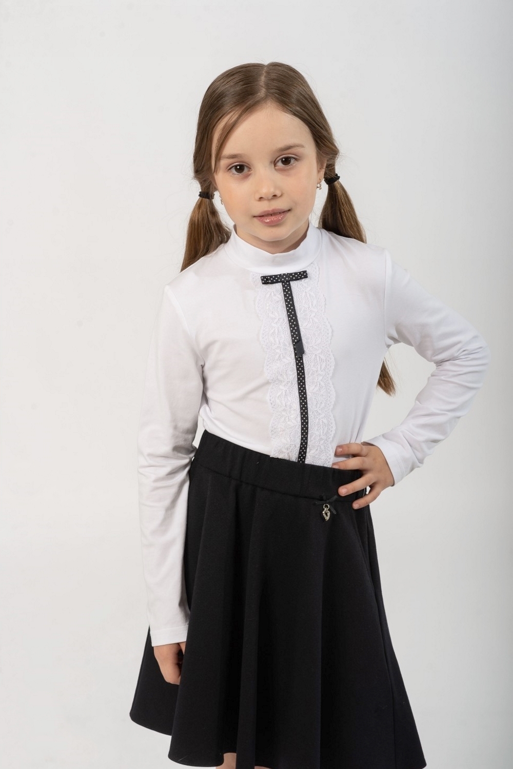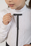 Нарядная белая водолазка с длинными рукавами для девочки. Изготовлена из трикотажного кулирного полотна, содержащего 95% хлопока обладающего высокой гипоаллергенностью, гигроскопичностью, мягкостью и эстетичным внешним видом. Незначительная добавка эластана обеспечивает формоустойчивость изделия и хорошую посадку по фигуре. Спереди модель декорирована кружевом и темно-синей в белую крапинку ленточкой. Водолазку необходимо стирать в режиме деликатной стирки при температуре 30 градусов. Модель водолазка дт-4791