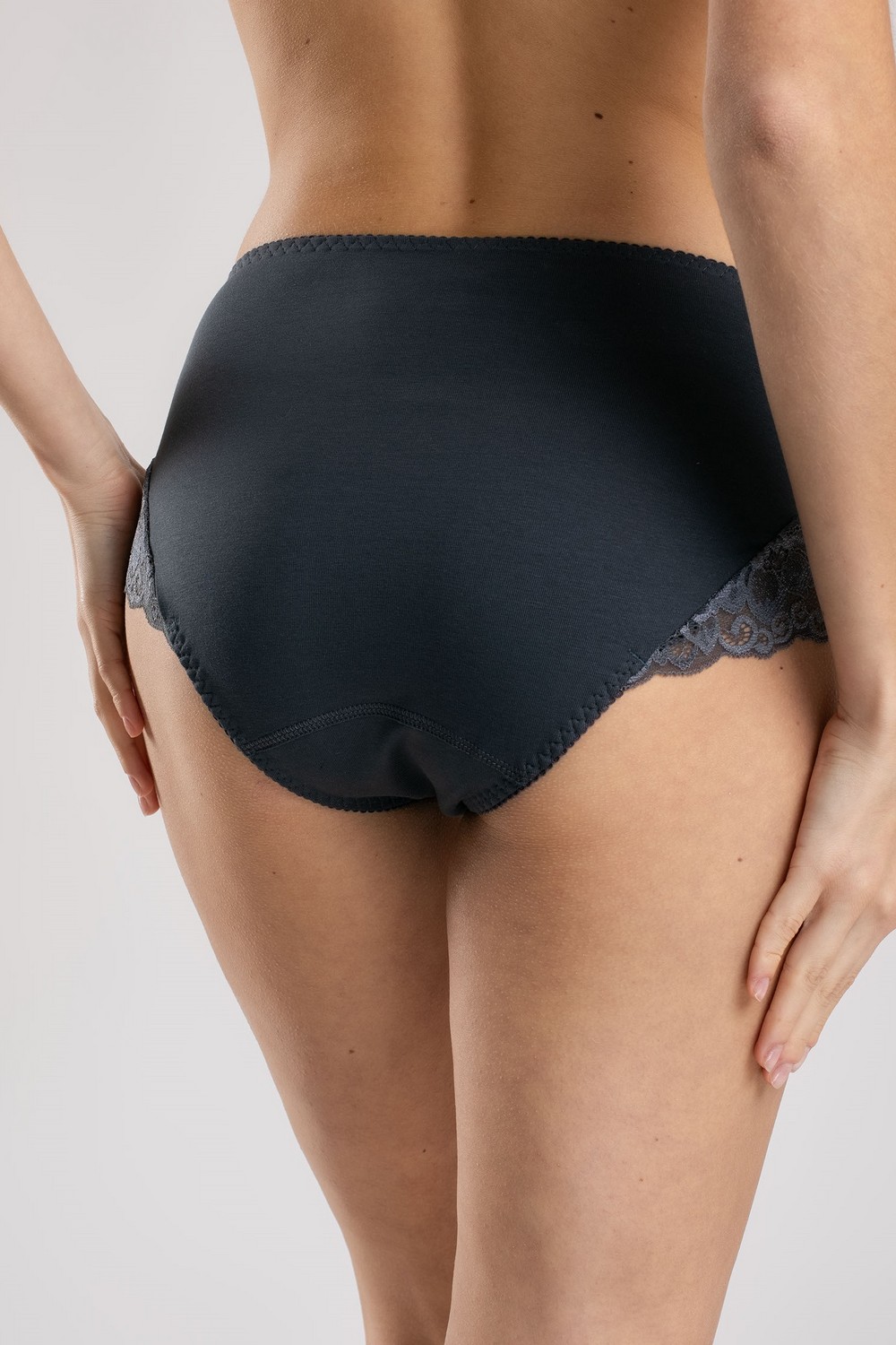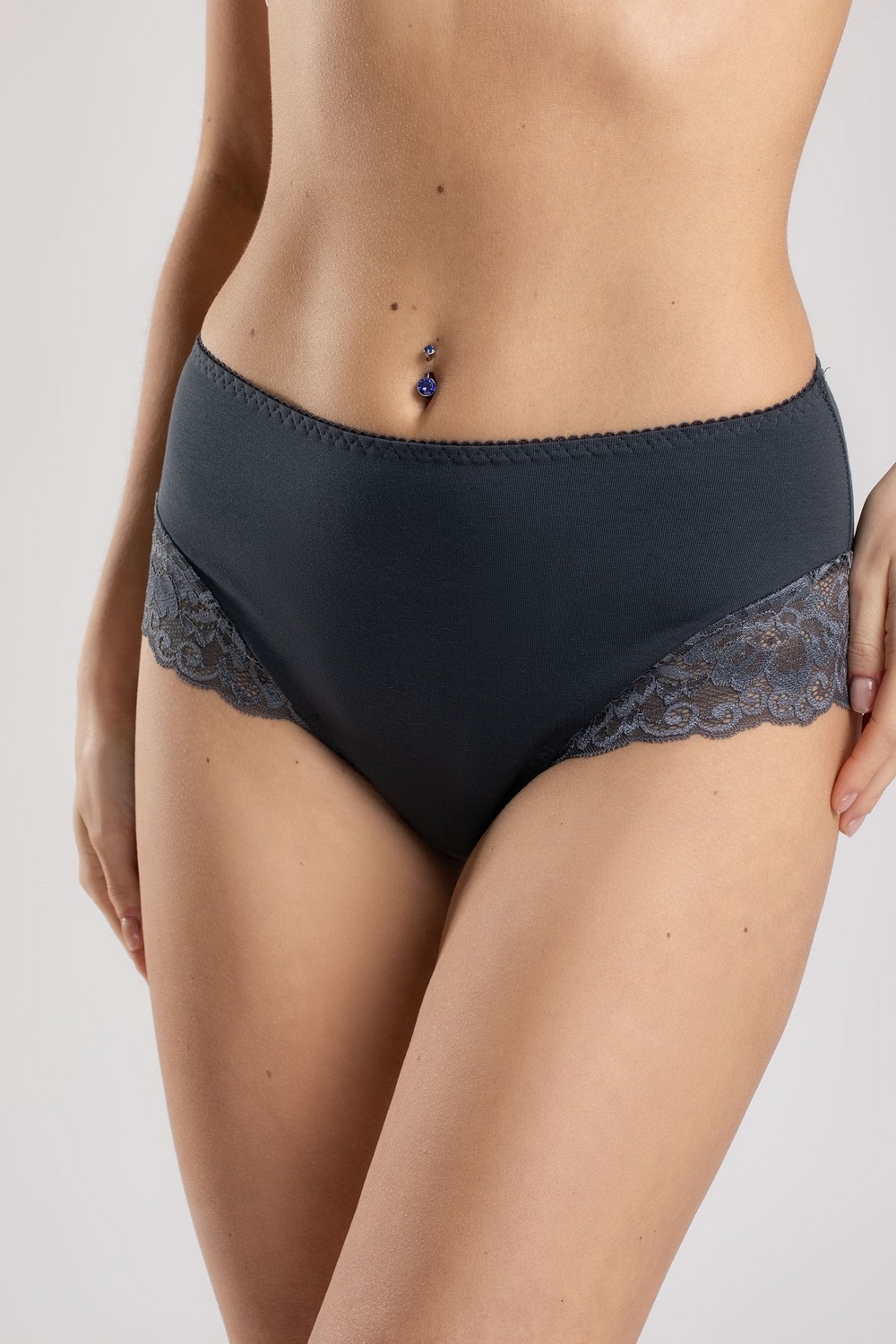 Темно-серые, цвета графит, женские трусы с высокой посадкой и средней линией бедра. Изготовлены из высококачественного трикотажного полотна, содержащего 80% натурального хлопка, который характеризуется высокой гигроскопичностью, воздухопроницаемостью, безопасностью для здоровья, гигиеничностью. По ножкам изделие украшено мягким кружевом в цвет основного полотна. Кружево вшито аккуратным стачным швом. Верхние срезы изделия обработаны тесьмой-резинкой с помощью трёхукольного зигзага. Ластовица двойная, продублирована основным полотном и пришита плоскими швами. Боковые швы - стачные. Продуманная конструкция, надежные эластичные швы, текстурированные нити, специальные закрепки на швах - гарантия долговечности изделия при соблюдении правил по уходу за ним. Модель трусы s4202